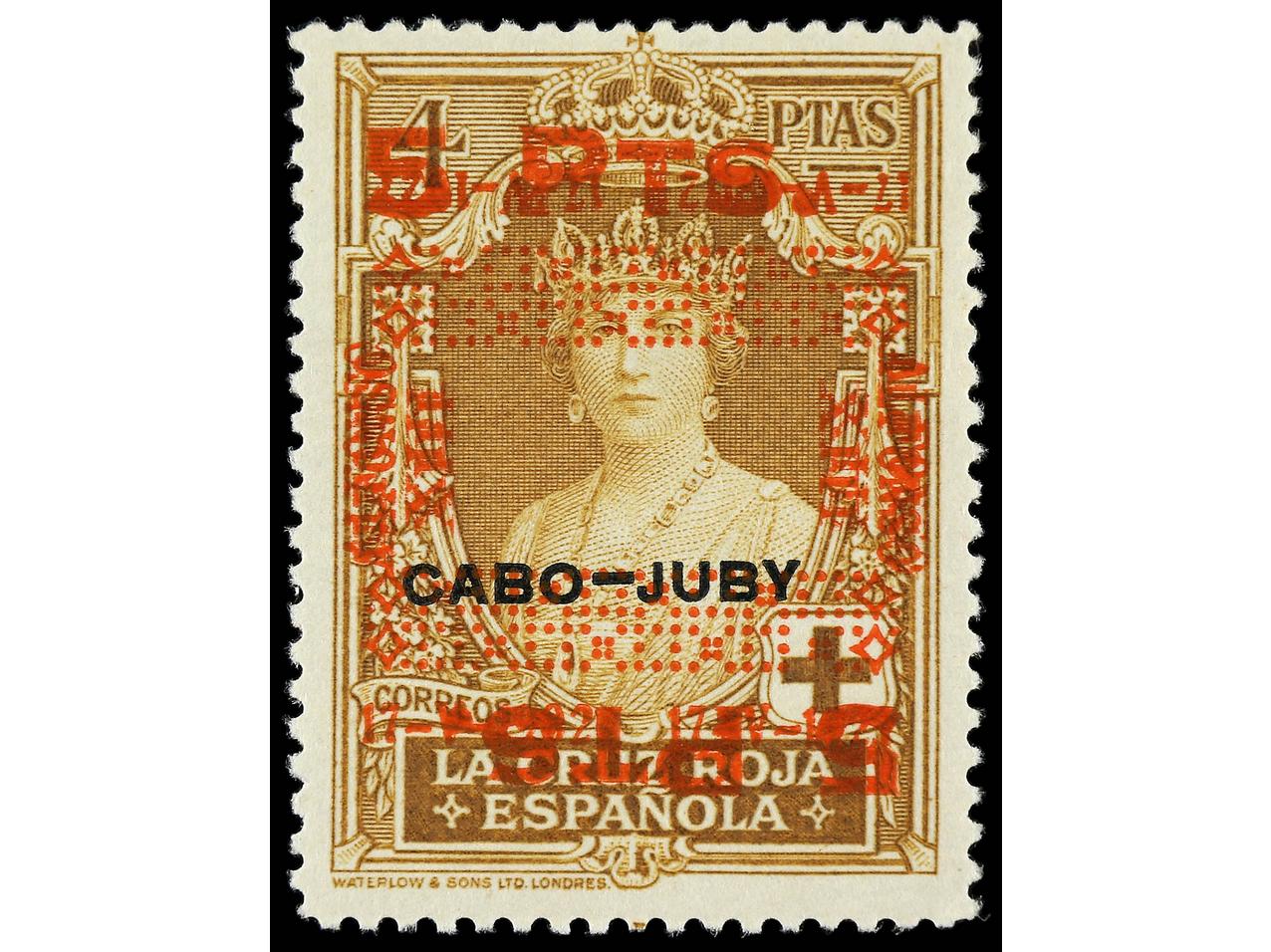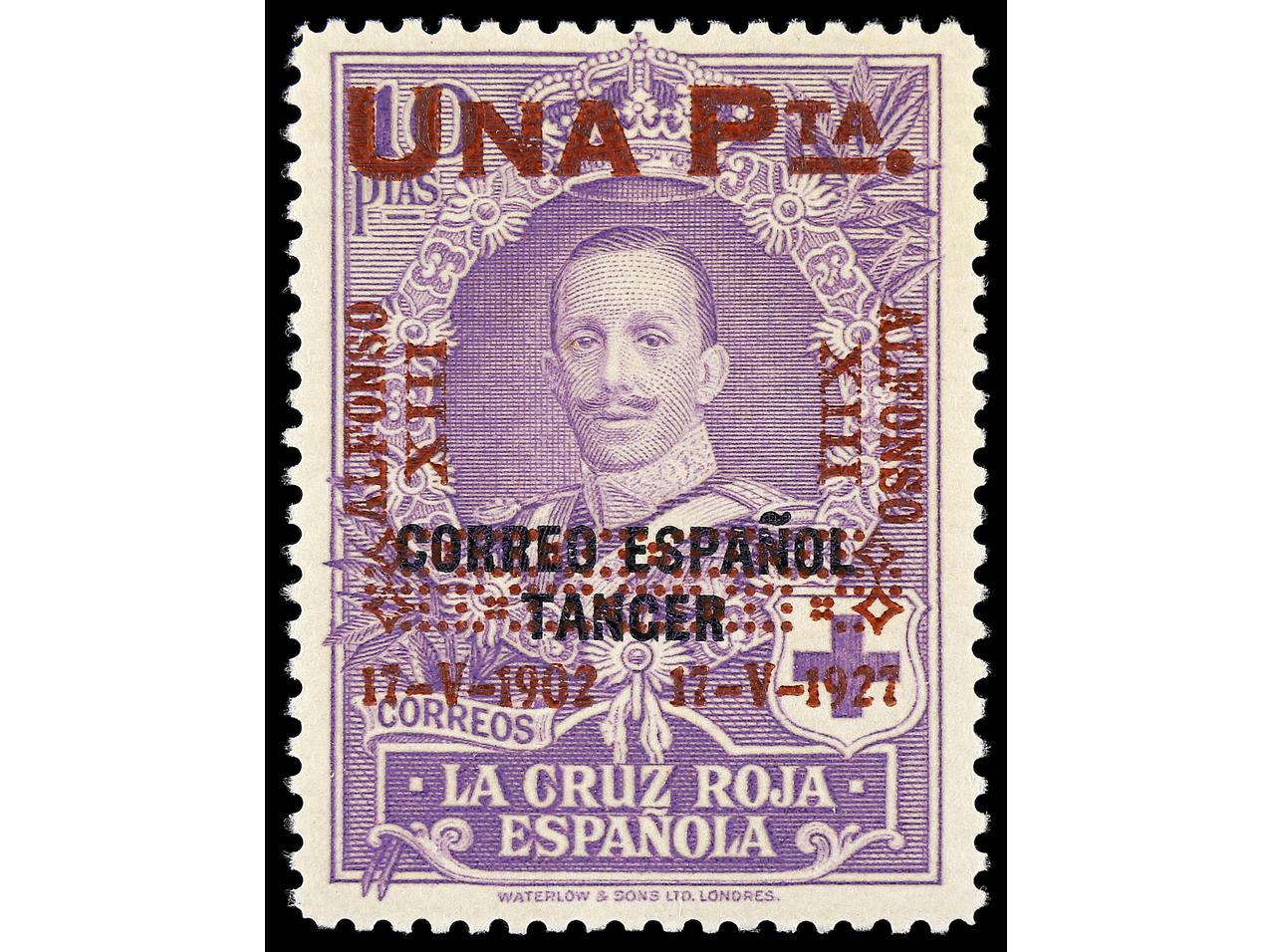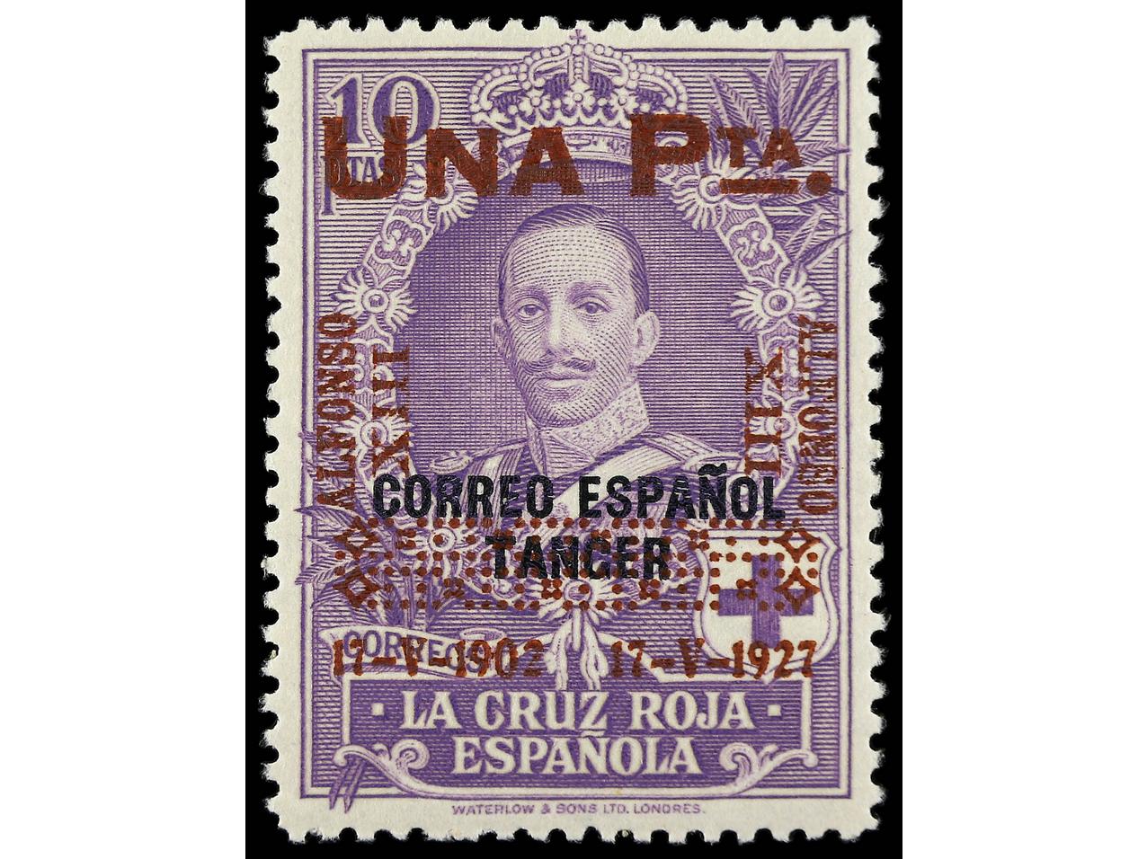 ESPAÑA. 1 pta. sobre 10 pts. violeta HABILITACIÓN TRIPLE, UNA INVERTIDA y 5 pts. sobre 4 pts. castaño. HABILITACIÓN DOBLE, UNA INVERTIDA. MUY RAROS. Cert. COMEX. Ed.395 y 400hhi. Cat. 1.000€. (Image1) (Image2)