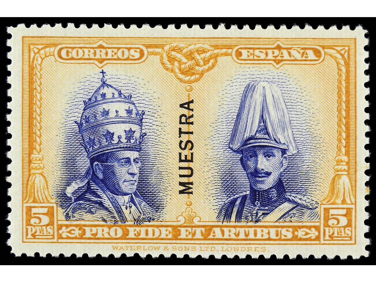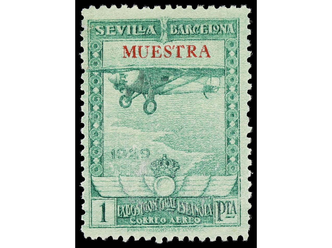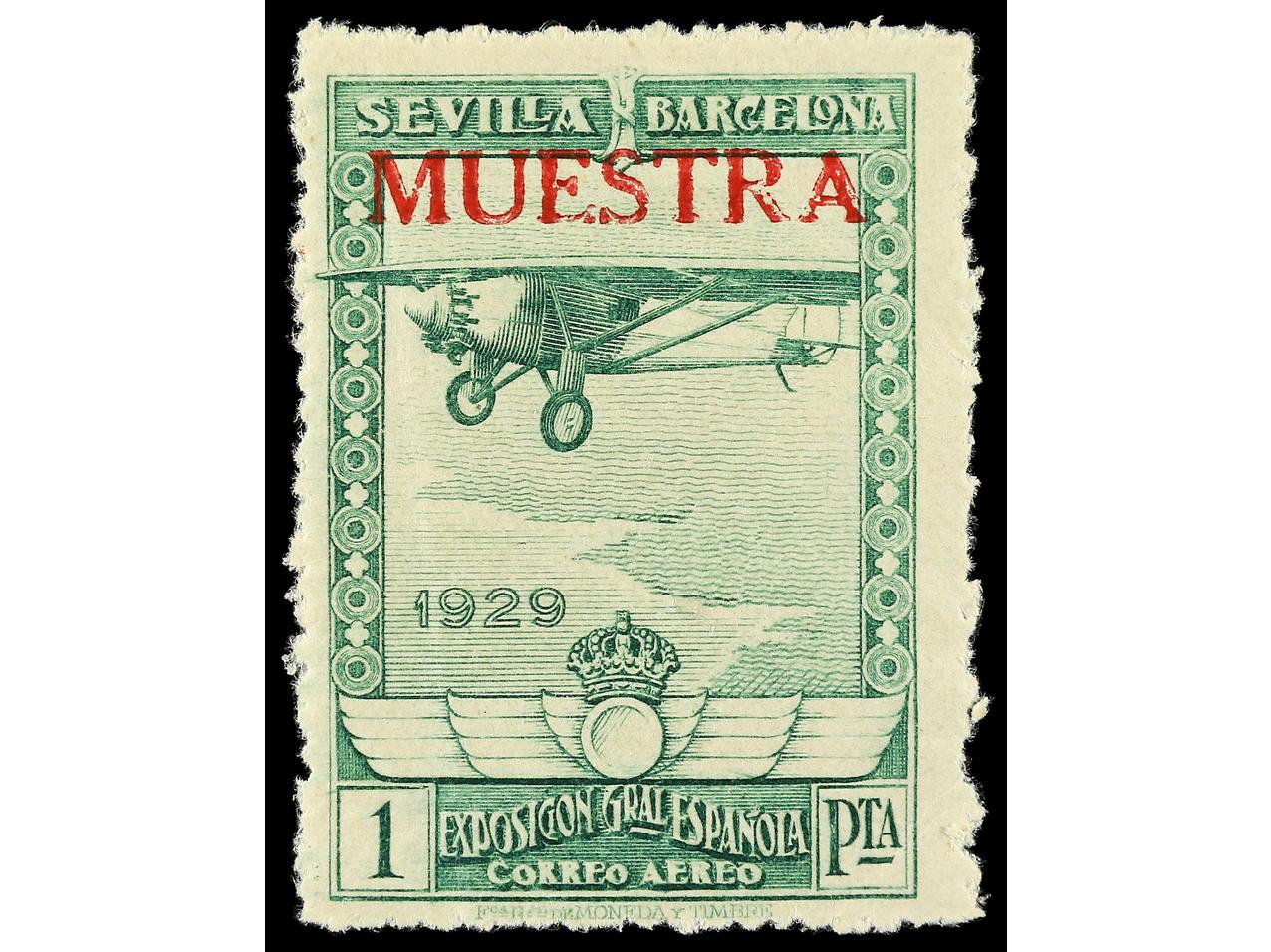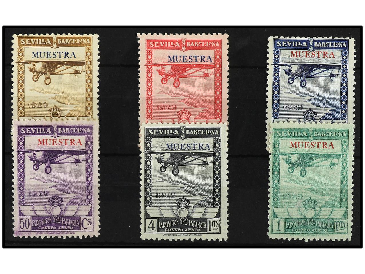 ESPAÑA. SERIE COMPLETA. 6 valores. Habilitación MUESTRA en letras gruesas y A 000.000 al reverso. 50 cts. algo descolorido y 1 pta. pliegue habitual del papel. Ed.448/53M. Cat. 420€. (Image1) (Image2)