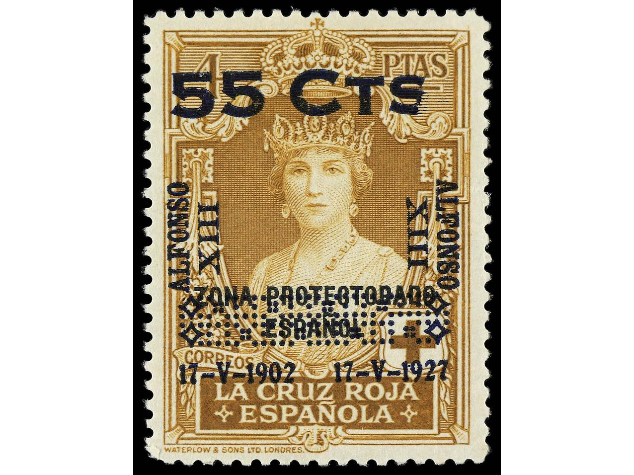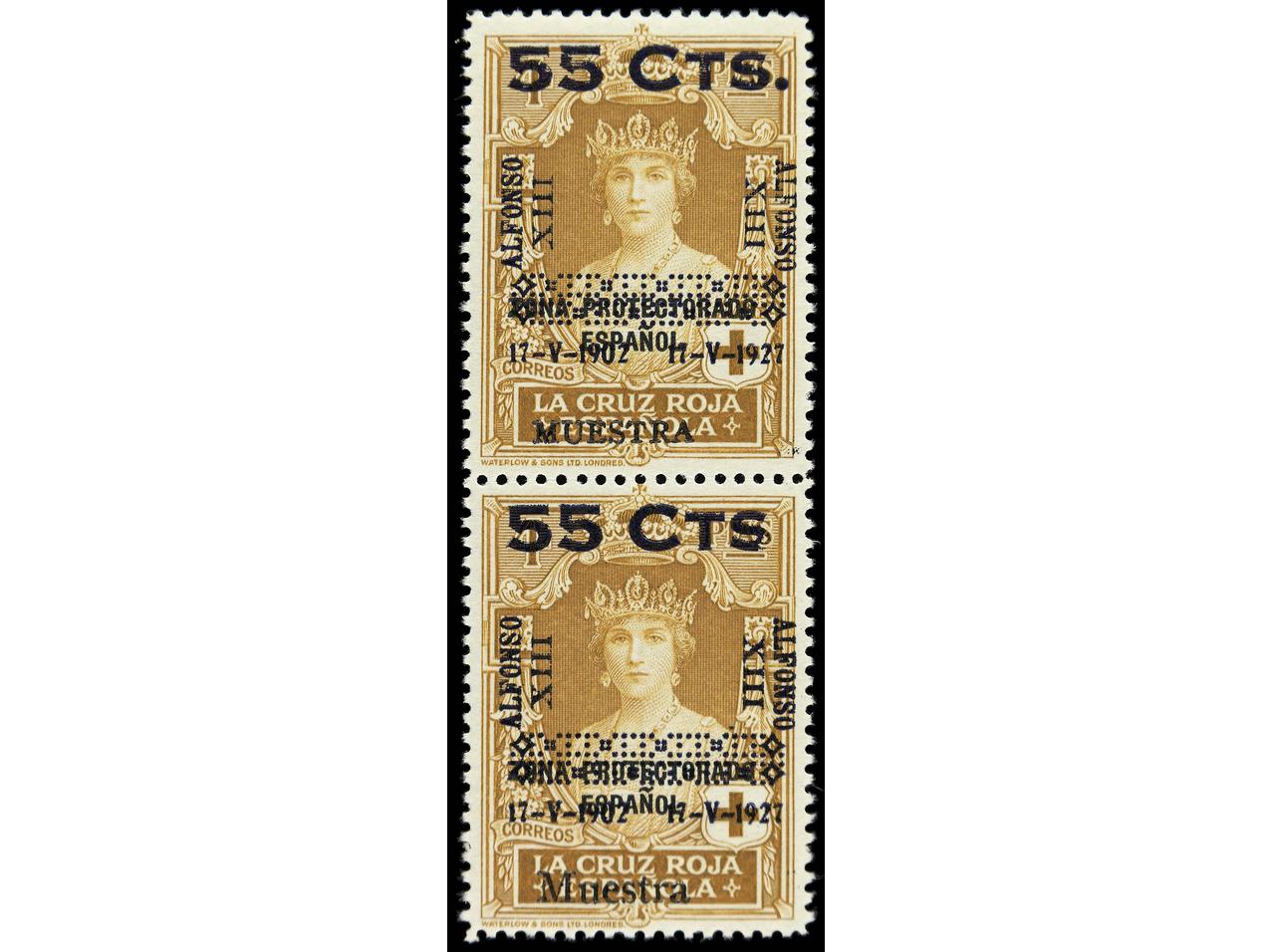 ESPAÑA. 55 cts. sobre 4 pts. castaño. Pareja vertical con los 2 tipos de HABILITACIÓN ´MUESTRA´ y ´Muestra´ (está sin punto después de ´CTS´. RARA. Ed.392M y Mb. Cat. +313€. (Image1)