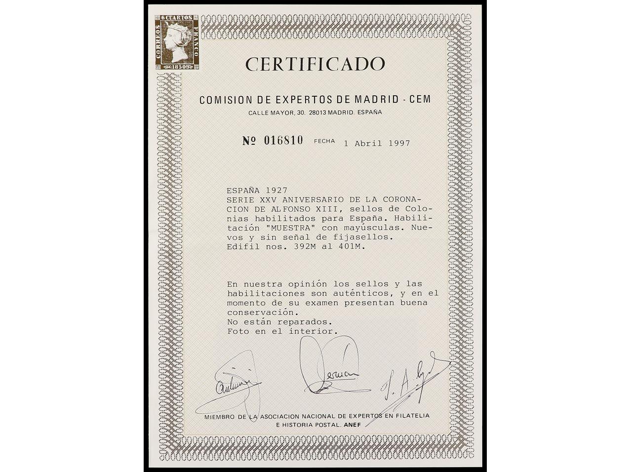 ESPAÑA. SERIE COMPLETA. 10 valores HABILITACIÓN MUESTRA. MUY RARA. Cert. CEM. Ed.392/401M. Cat. +1.275€. (Image1) (Image2)