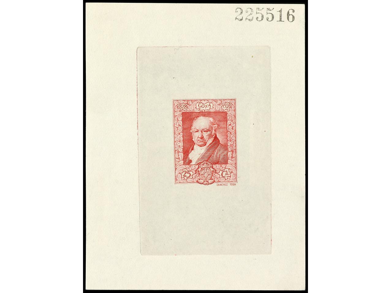 ESPAÑA. GOYA. PRUEBA DE PUNZÓN. Leyendas 1828-1928 en color rosa. (Gálvez 2558). (Image1)