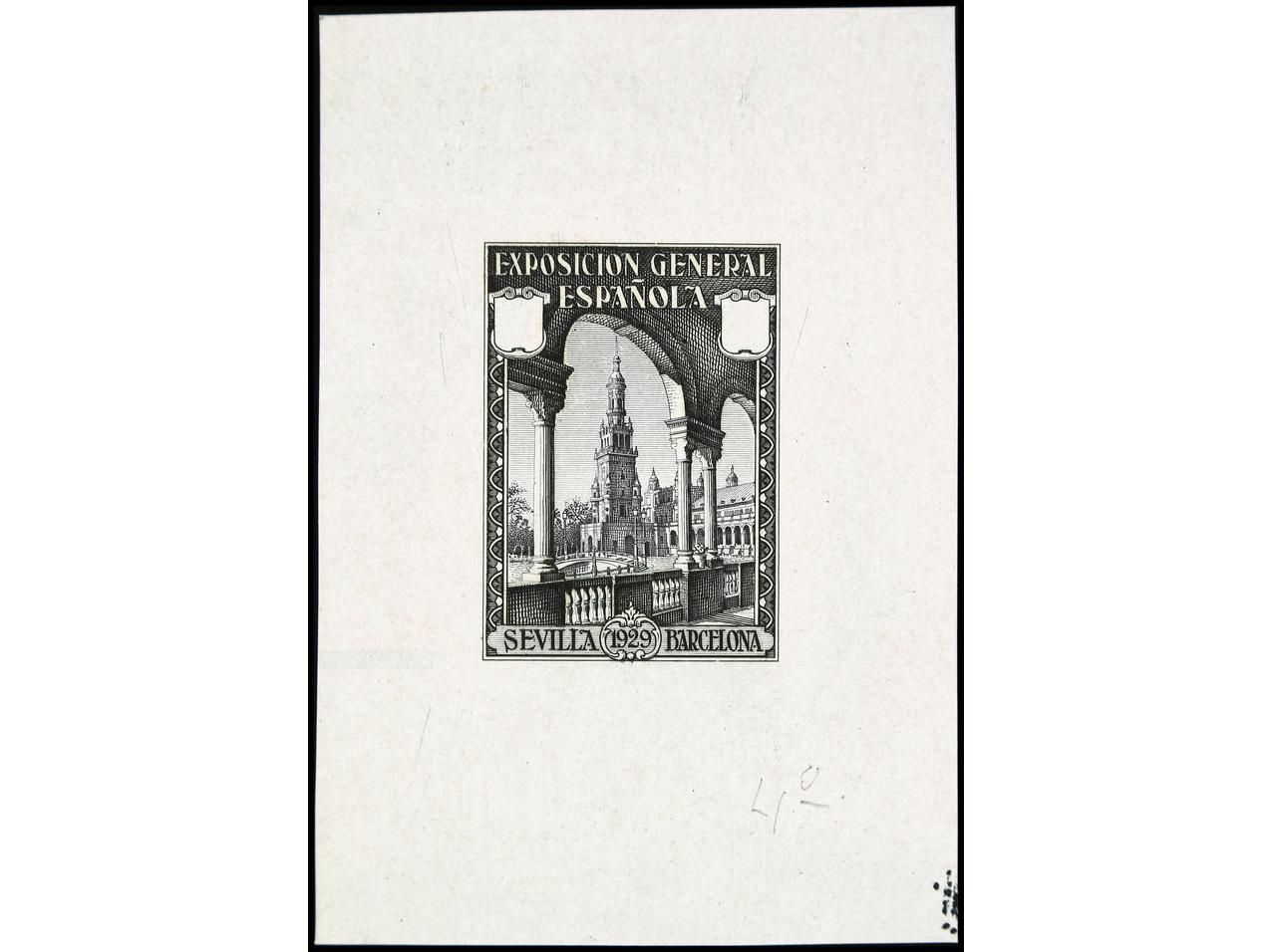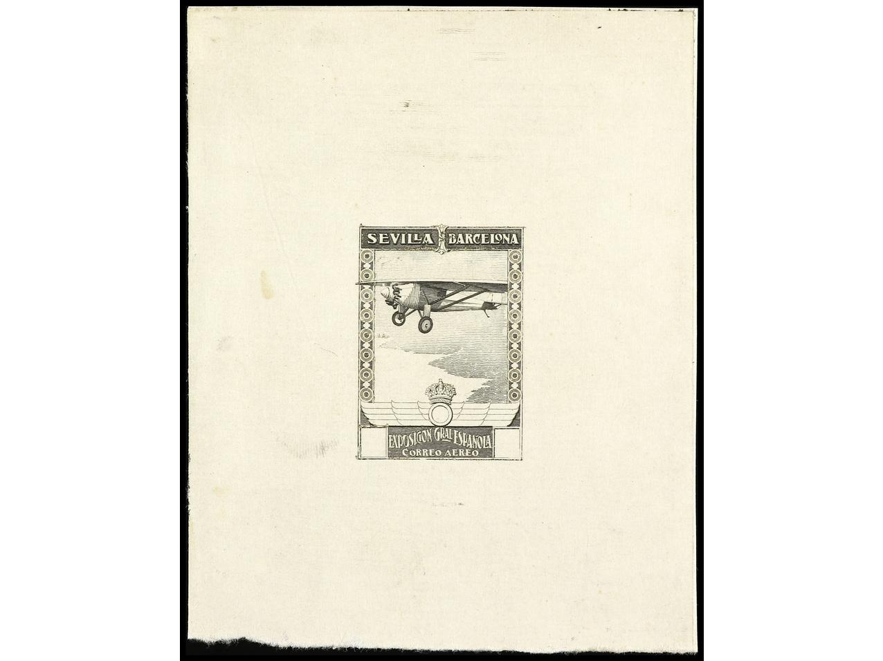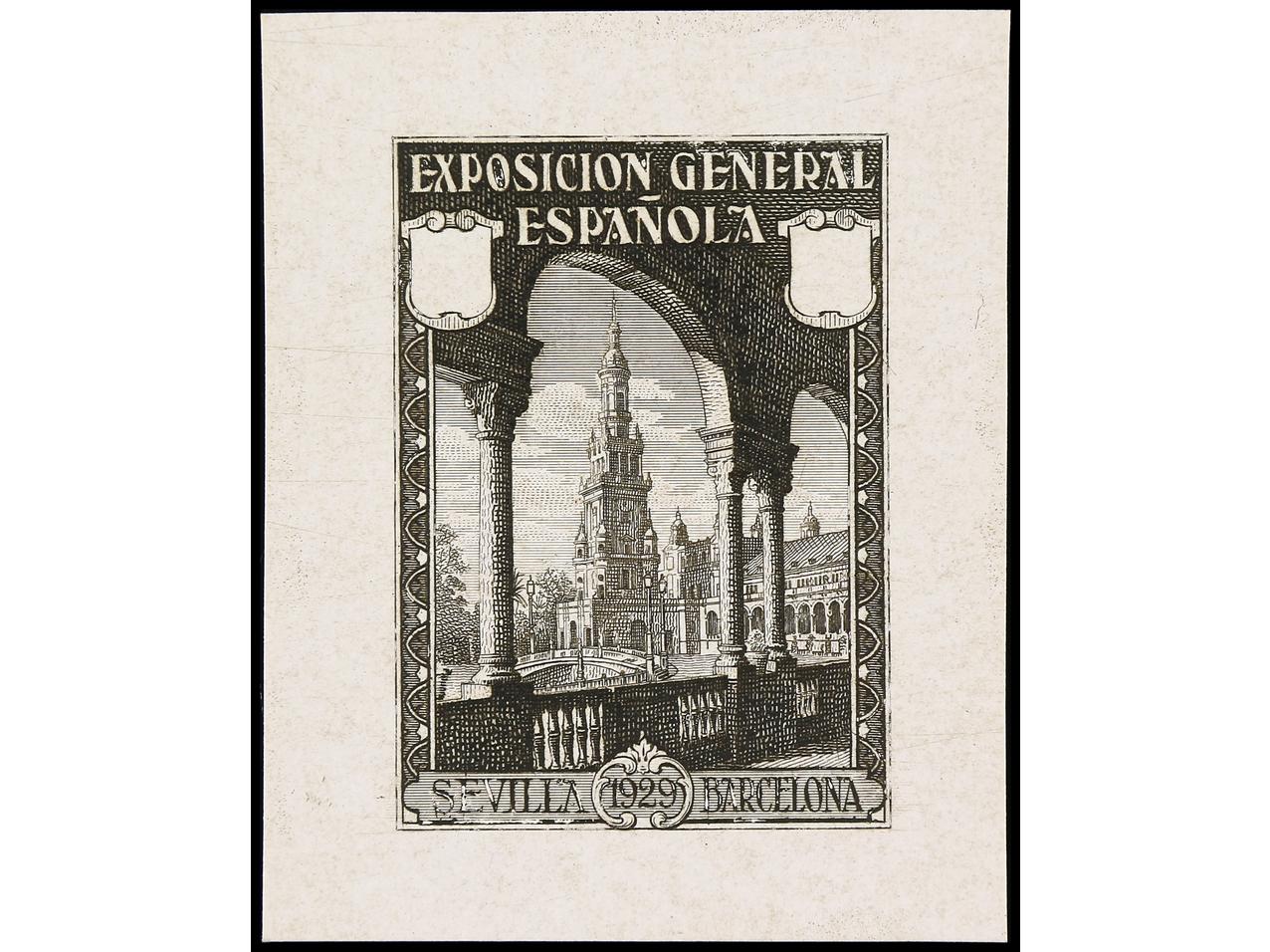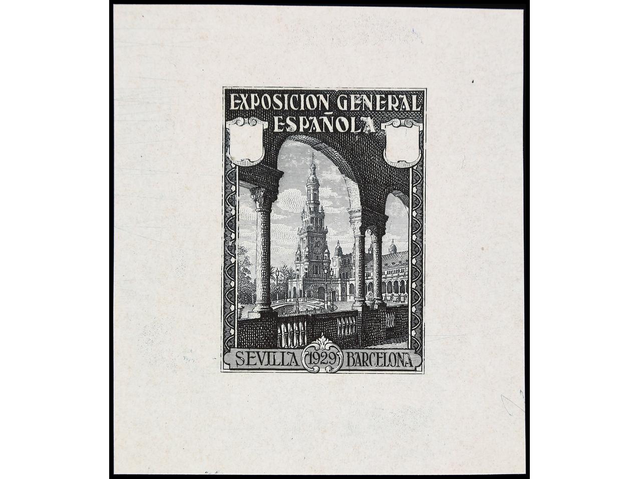 ESPAÑA. EXPO. SEVILLA y BARCELONA. PRUEBA DE PUNZÓN. Sin el valor y sin nubes en el cielo en color negro sobre papel estucado. RARA. (Gálvez 2375).