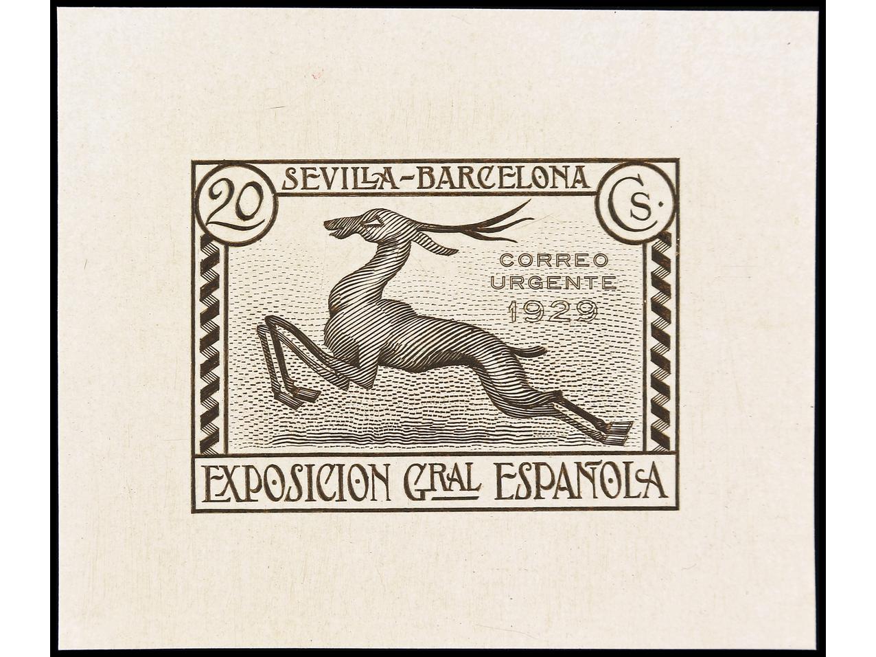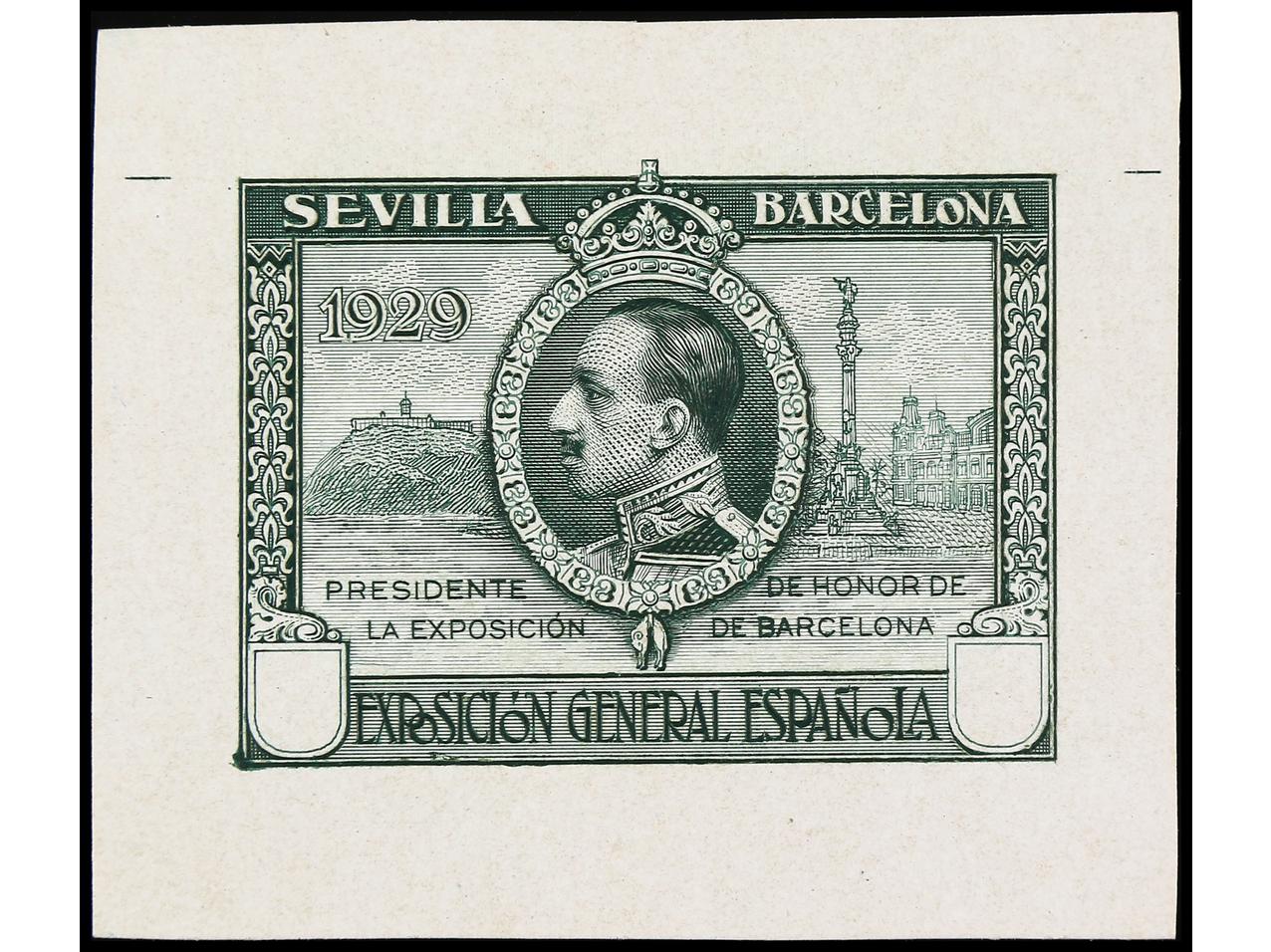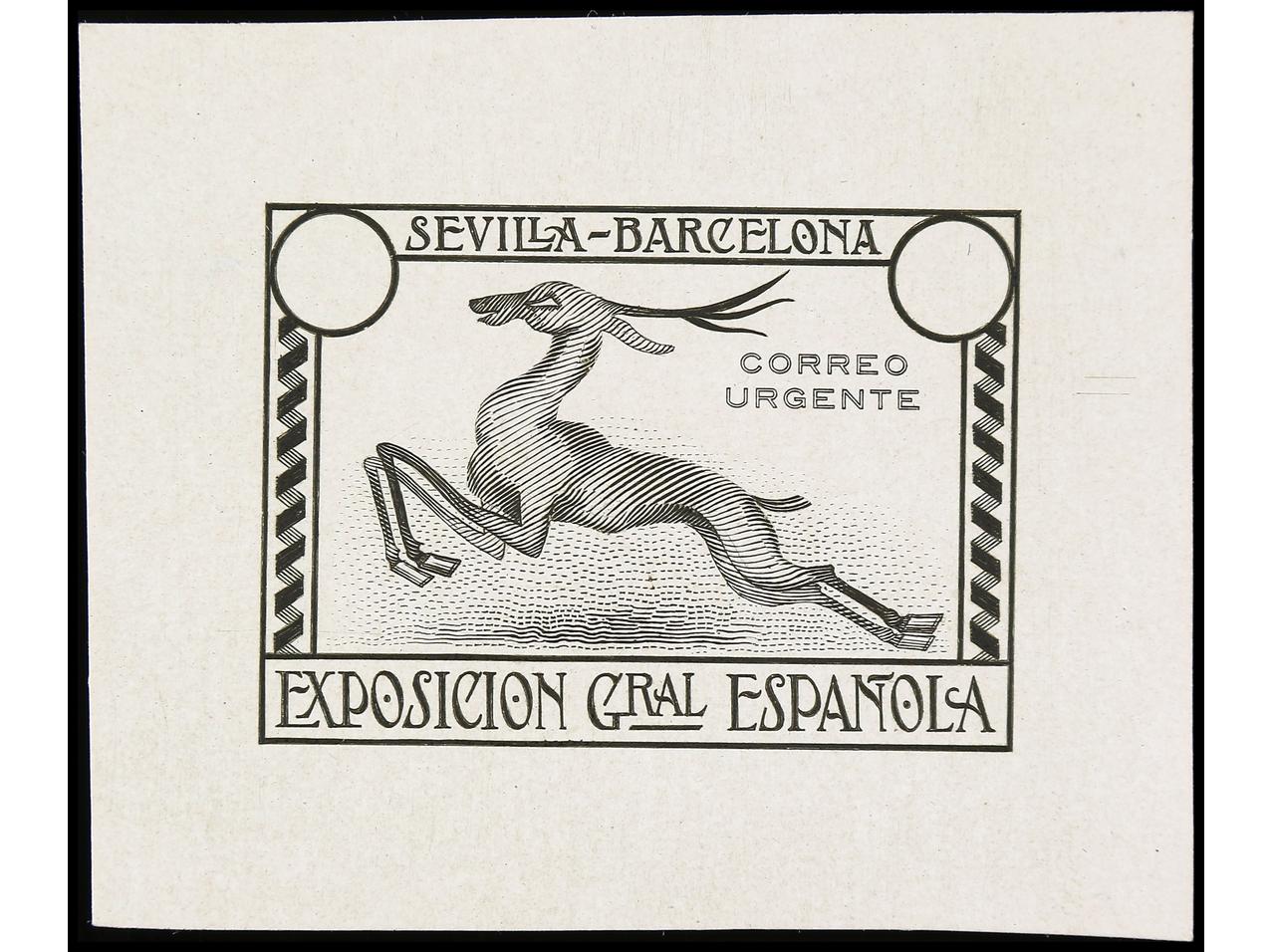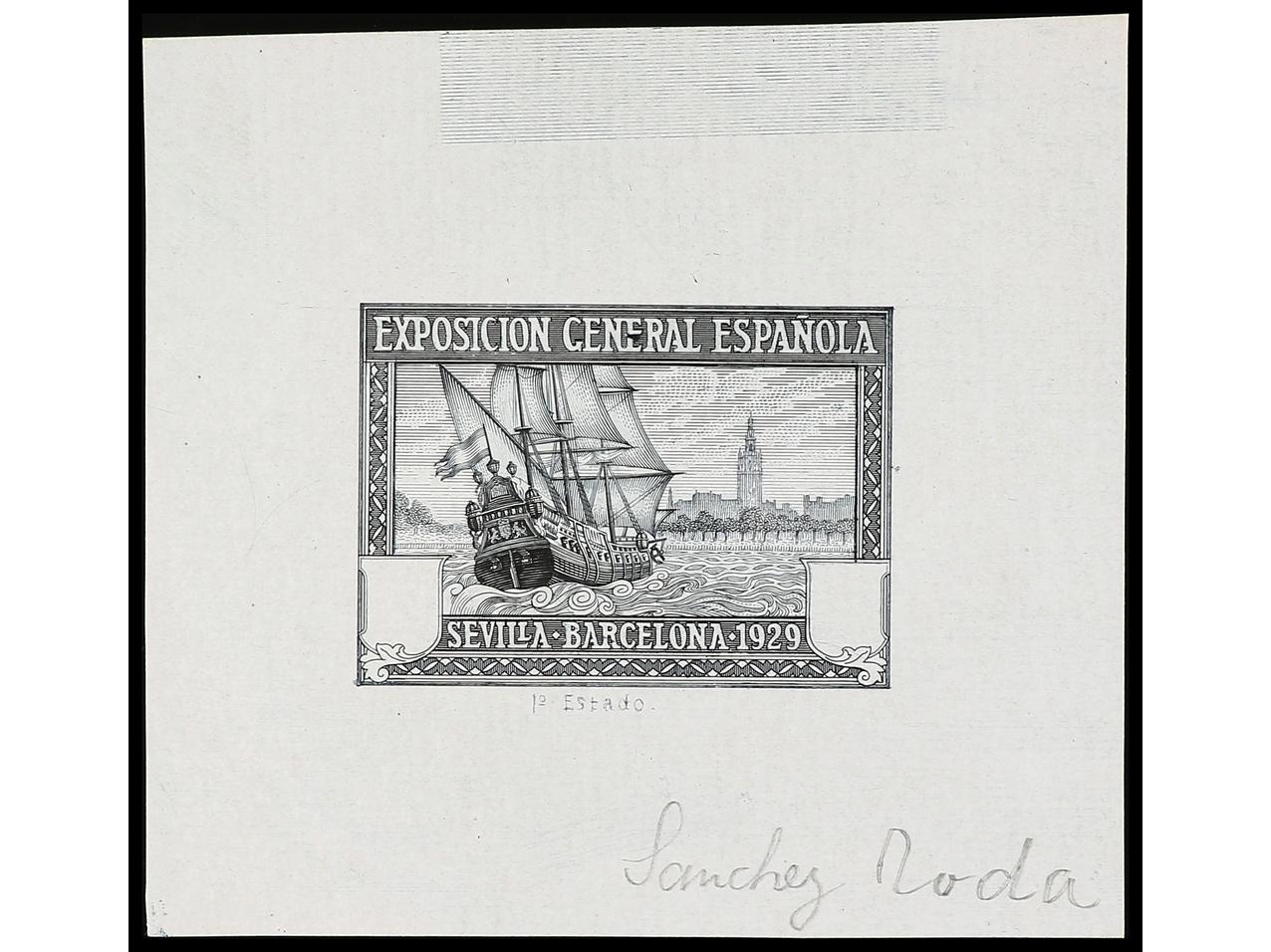 ESPAÑA. EXPO. SEVILLA y BARCELONA. PRUEBA DE PUNZÓN. Sin el valor y sin nubes en el cielo en color negro sobre papel estucado. RARA. (Gálvez 2375).