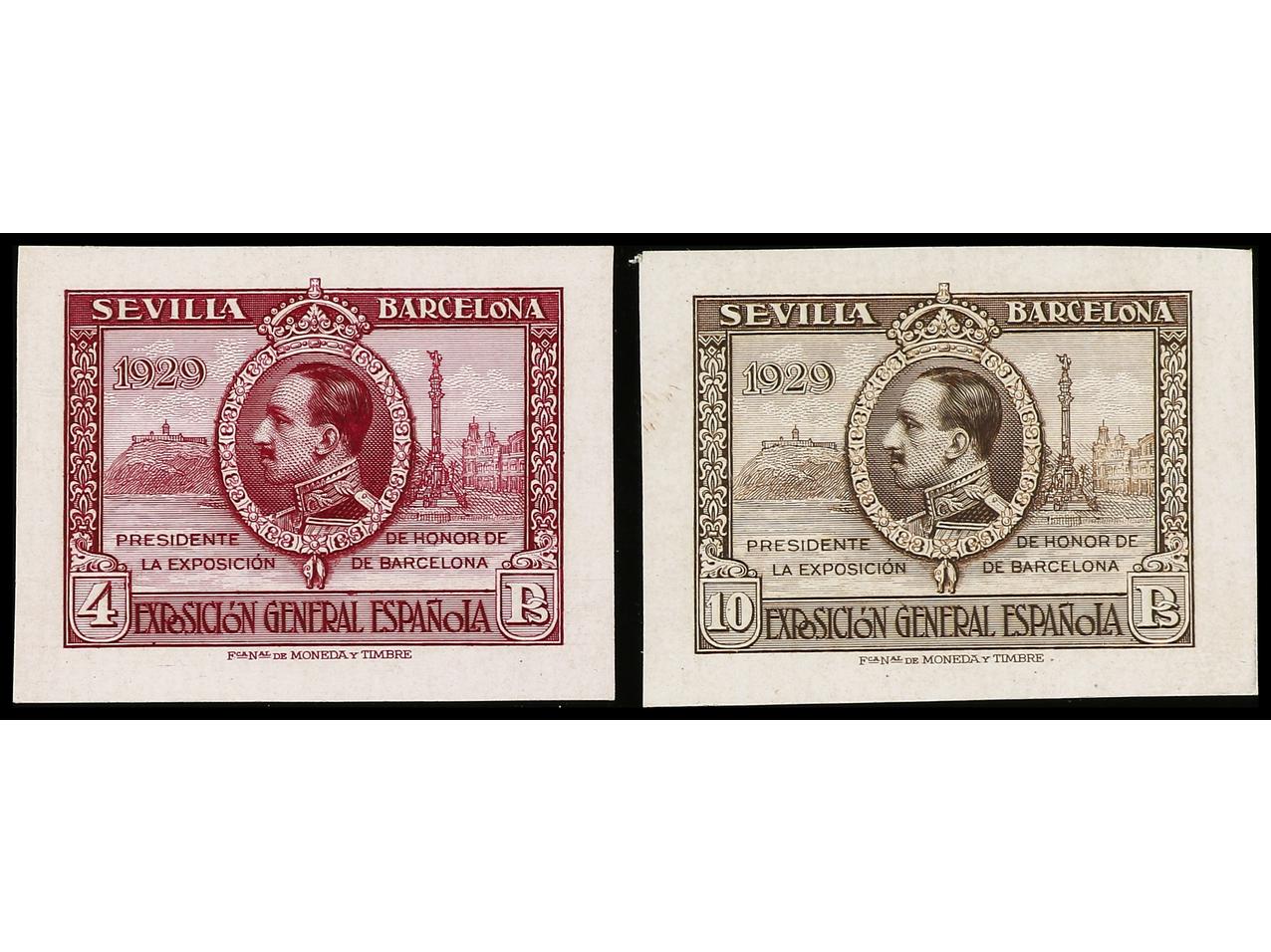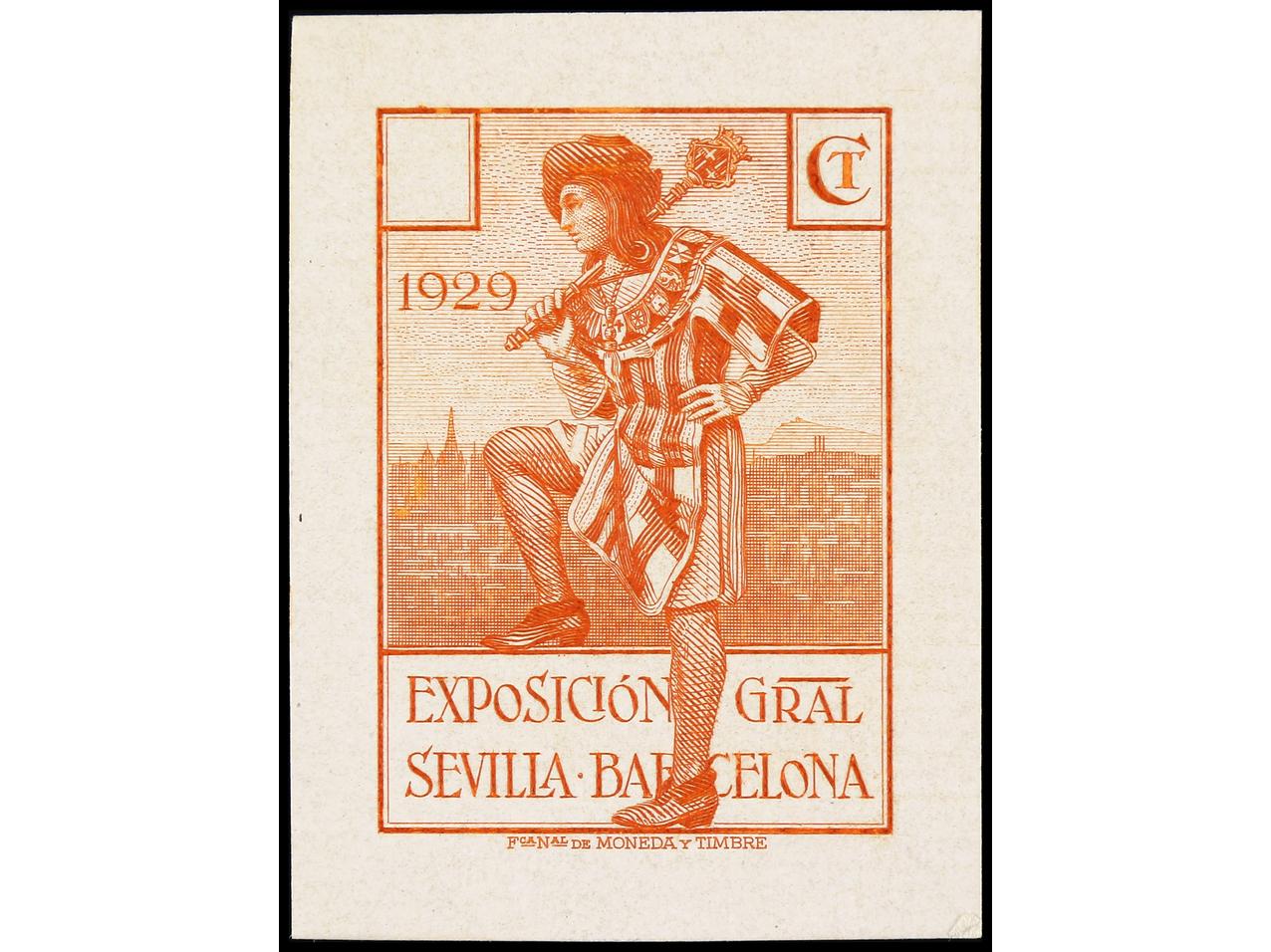 ESPAÑA. EXPO. SEVILLA y BARCELONA. PRUEBA DE PUNZÓN. Sin 1929, sin valor en los cartuchos y sin pie de imprenta en color castaño. MUY RARA. (Gálvez CA 65).