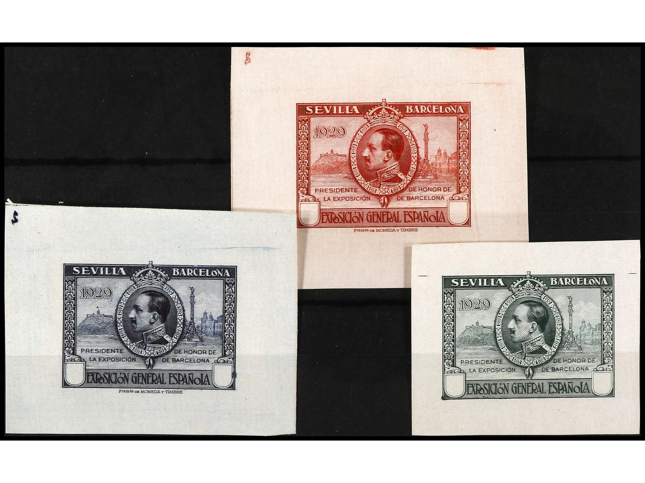 ESPAÑA. EXPO. SEVILLA y BARCELONA. PRUEBAS DE PUNZÓN. 3 pruebas sin el valor sobre papel estucado. Conjunto completo. (Gálvez 2378/80). (Image1) (Image2)