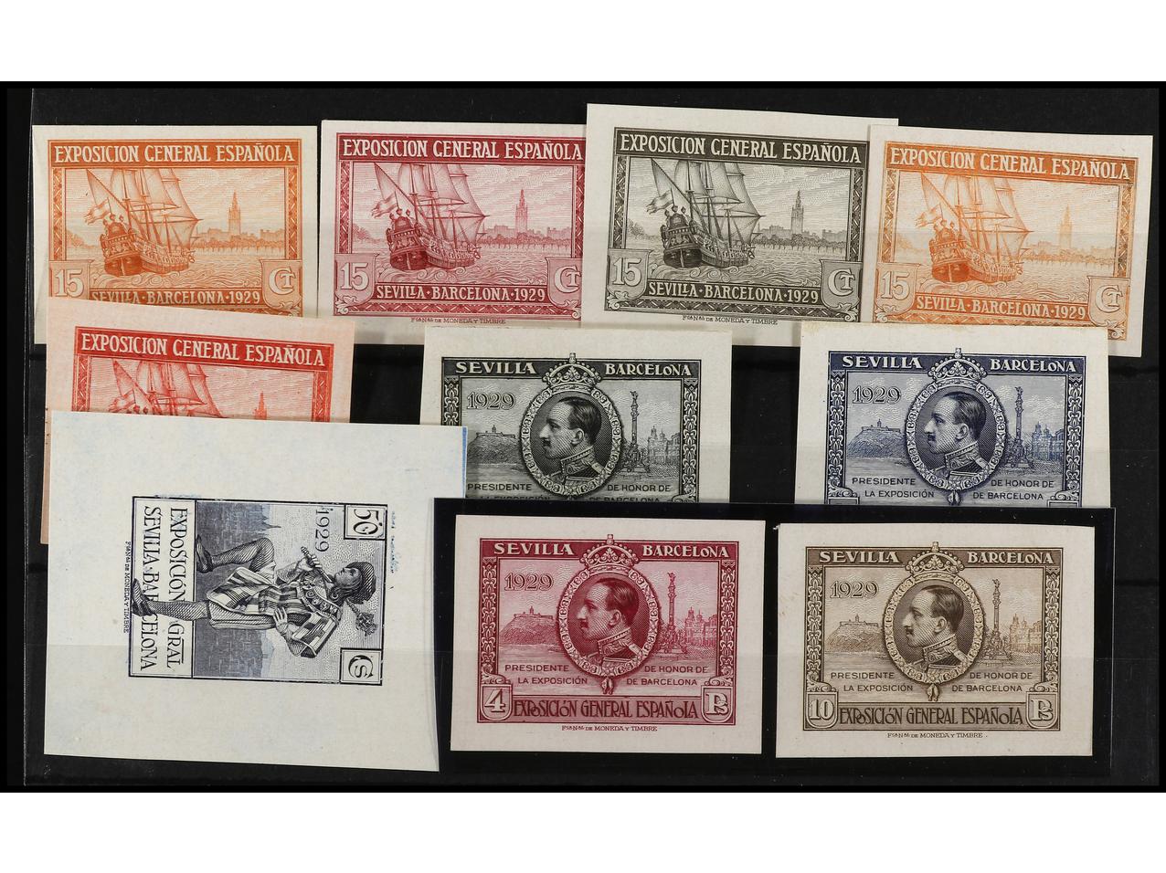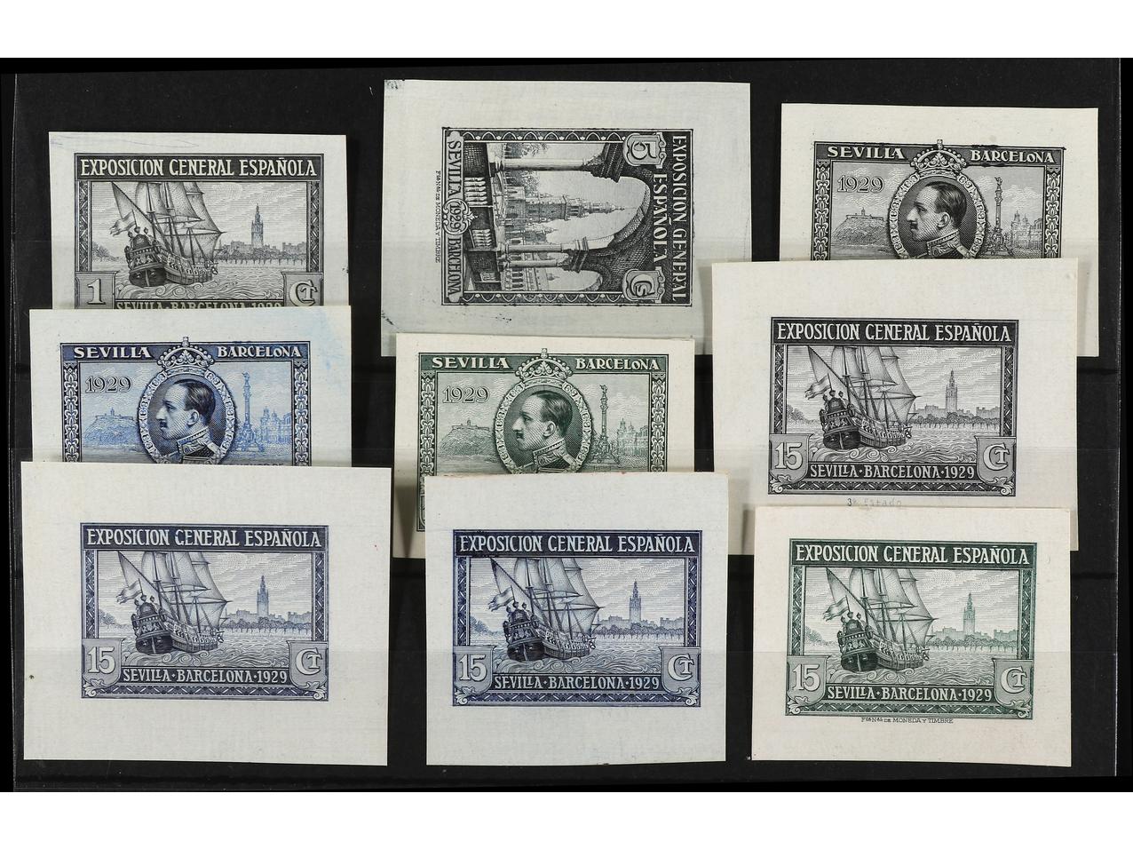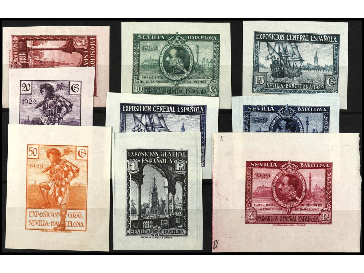 ESPAÑA. EXPO. SEVILLA y BARCELONA. PRUEBAS DE PUNZÓN. 9 pruebas sobre papel ordinario. Conjunto completo. (Gálvez 2415/23). (Image1) (Image2)