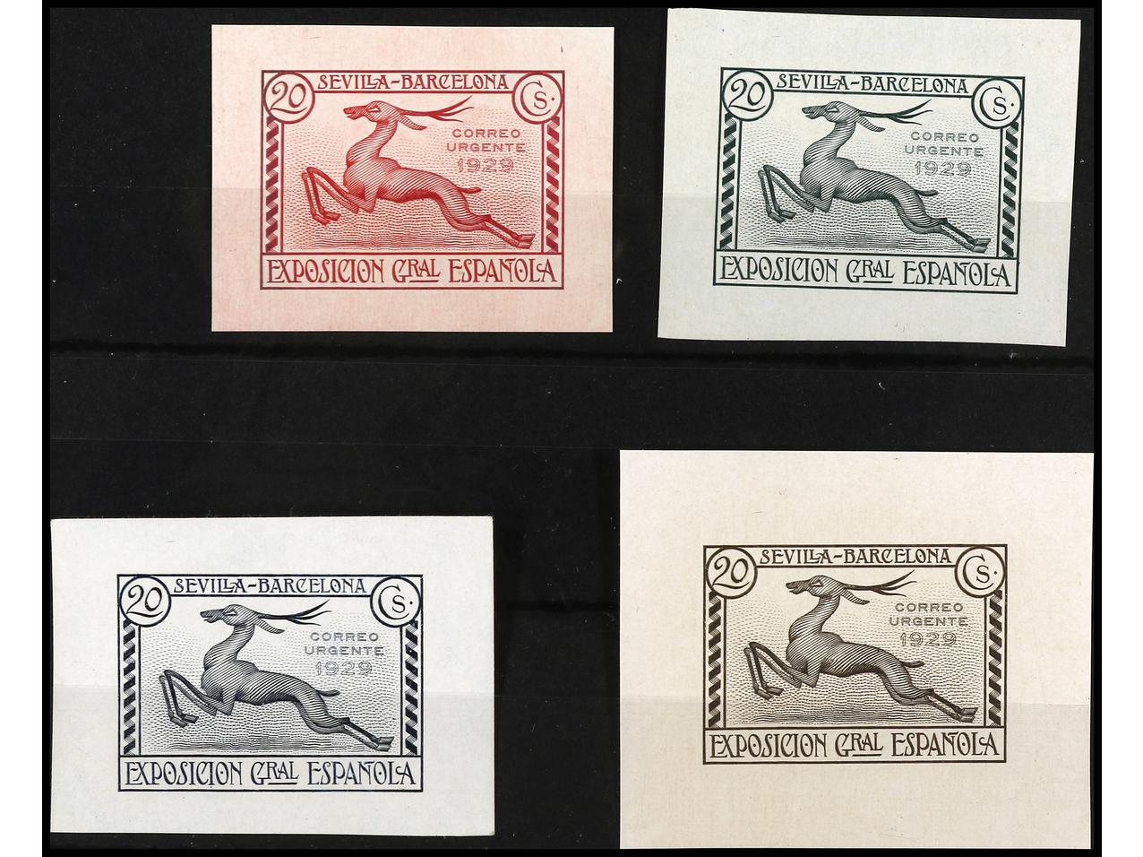 ESPAÑA. EXPO. SEVILLA y BARCELONA. PRUEBAS DE PUNZÓN. 4 pruebas del sello de Correo Urgente sobre papel estucado. (Gálvez 2407/10). (Image1) (Image2)