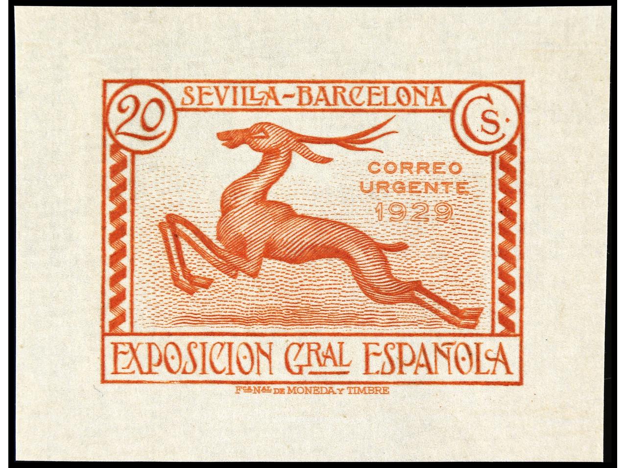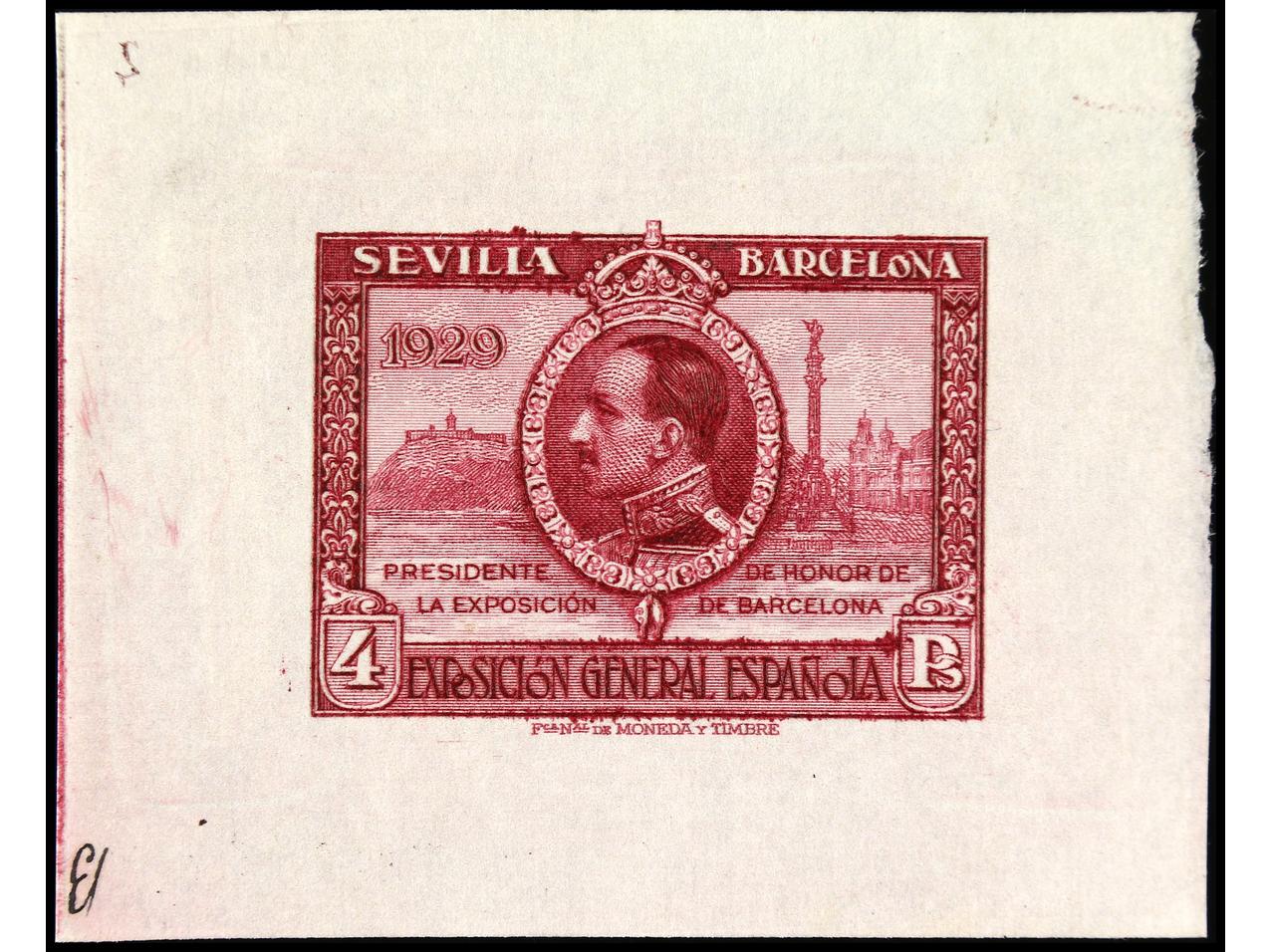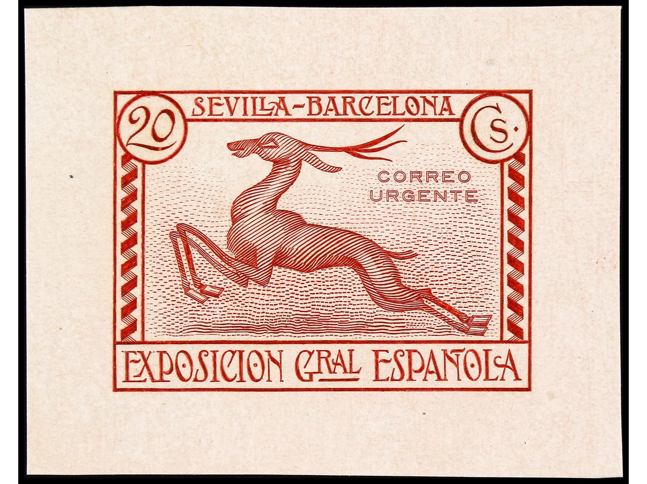 ESPAÑA. EXPO. SEVILLA y BARCELONA. PRUEBA DE PUNZÓN. Sin el valor y con nubes en el cielo en color castaño sobre papel estucado. RARA. (Gálvez 2374).