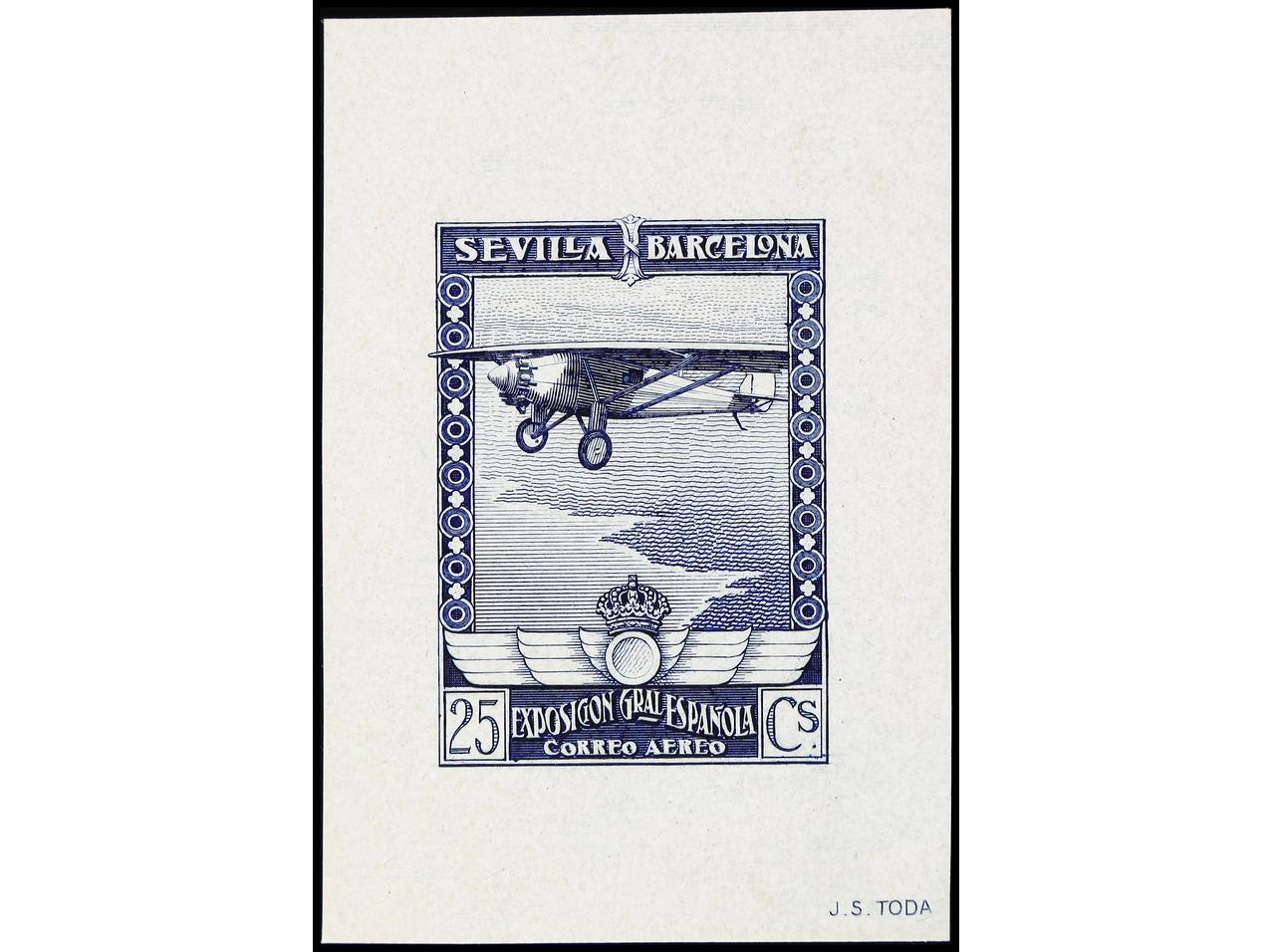 ESPAÑA. EXPO. SEVILLA y BARCELONA. CORREO AÉREO. PRUEBA DE PUNZÓN. 25 cts. azul sin ´1929´ sin pie de imprenta y firma J.S. TODA. RARA. (Gálvez CA 66).