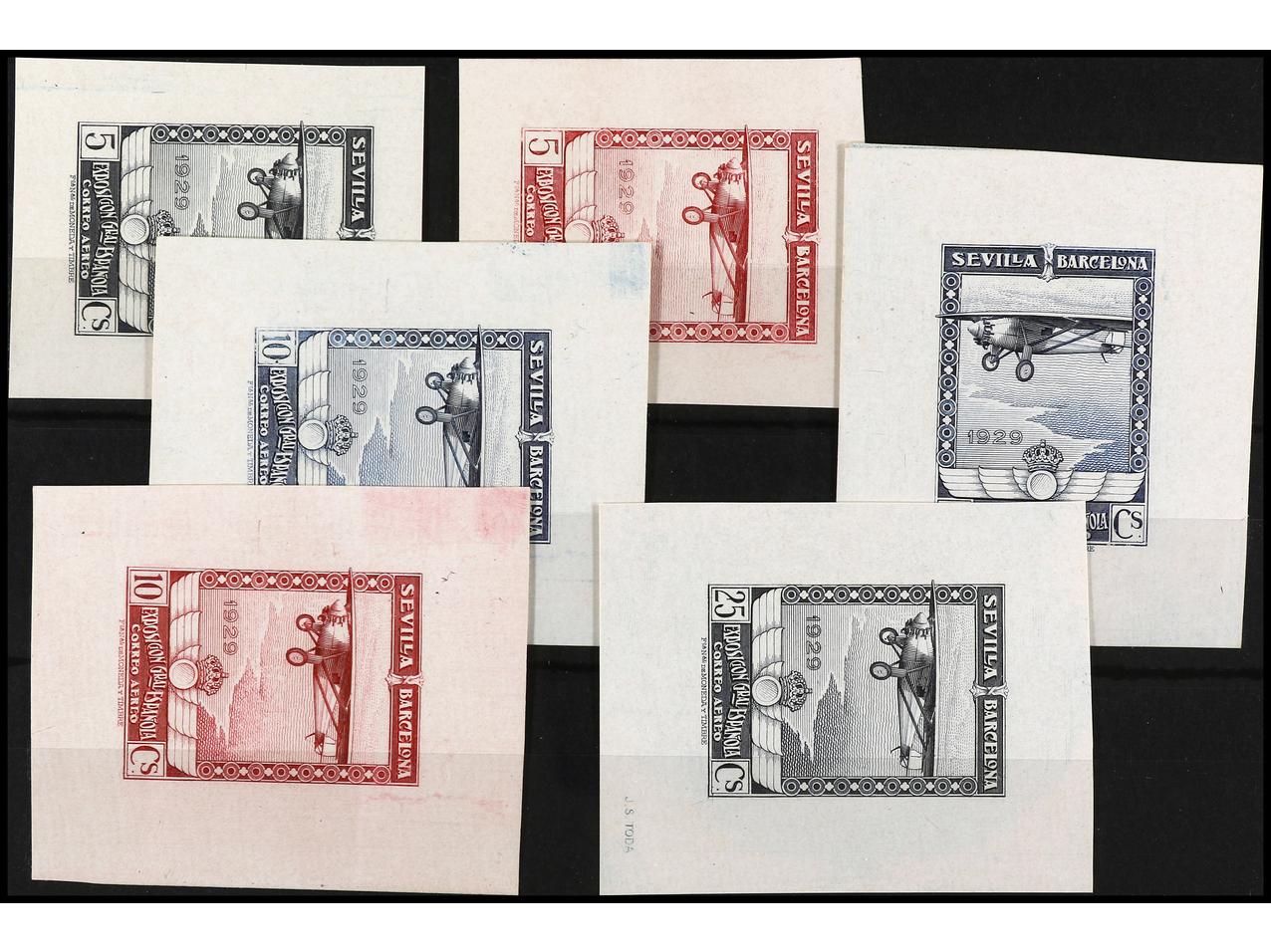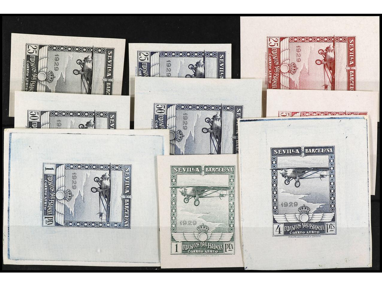 ESPAÑA. EXPO. SEVILLA y BARCELONA. CORREO AÉREO. PRUEBAS DE PUNZÓN. 14 pruebas sobre cartulina estucada. Conjunto completo. Muy raro de encontrar así. (Gálvez CA 71/84). (Image1) (Image2)
