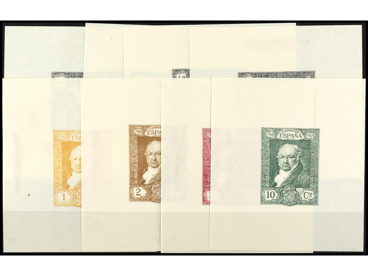 ESPAÑA. GOYA. PRUEBAS DE LOS REPORTES LITOGRÁFICOS. 8 pruebas de los valores de 1, 2, 5 y 10 cts. en negro y en los colores adoptados. RARAS. (Gálvez 2573/80).
