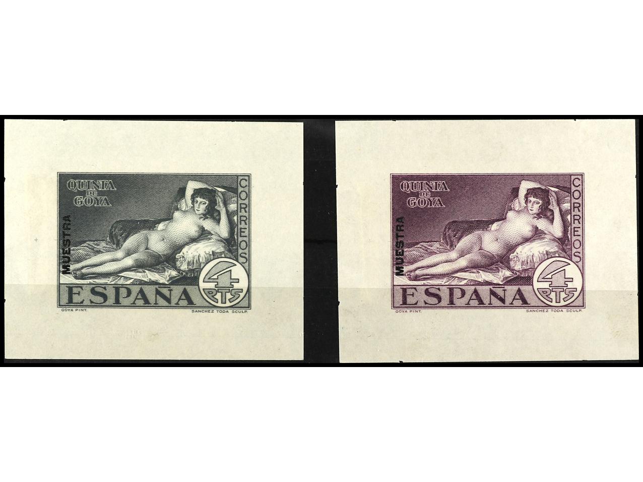 ESPAÑA. GOYA. PRUEBAS DE PUNZÓN. 2 pruebas. 4 pts. gris y 4 pts. lila con hablitación MUESTRA. (Gálvez 2608/09). (Image1) (Image2)