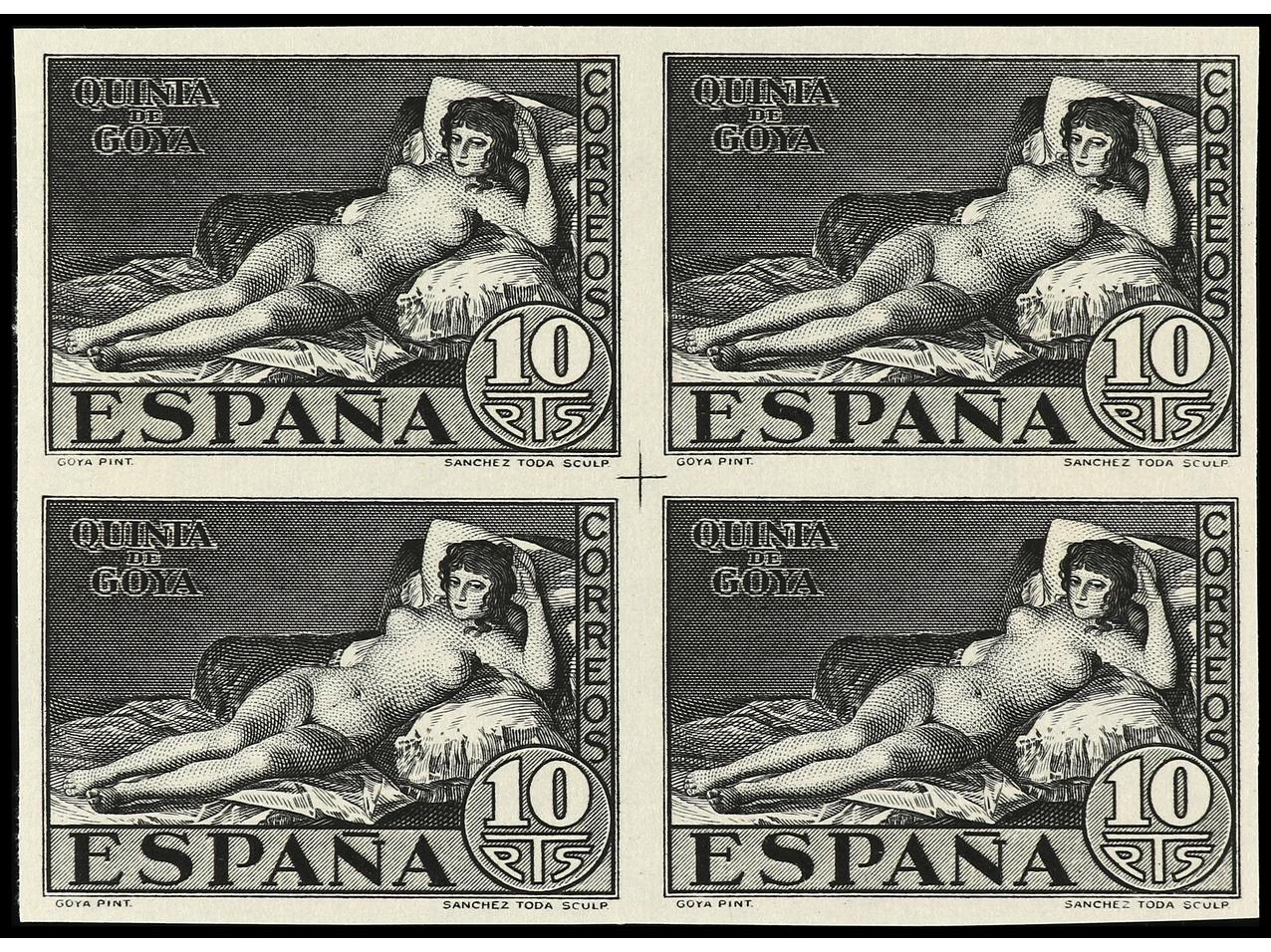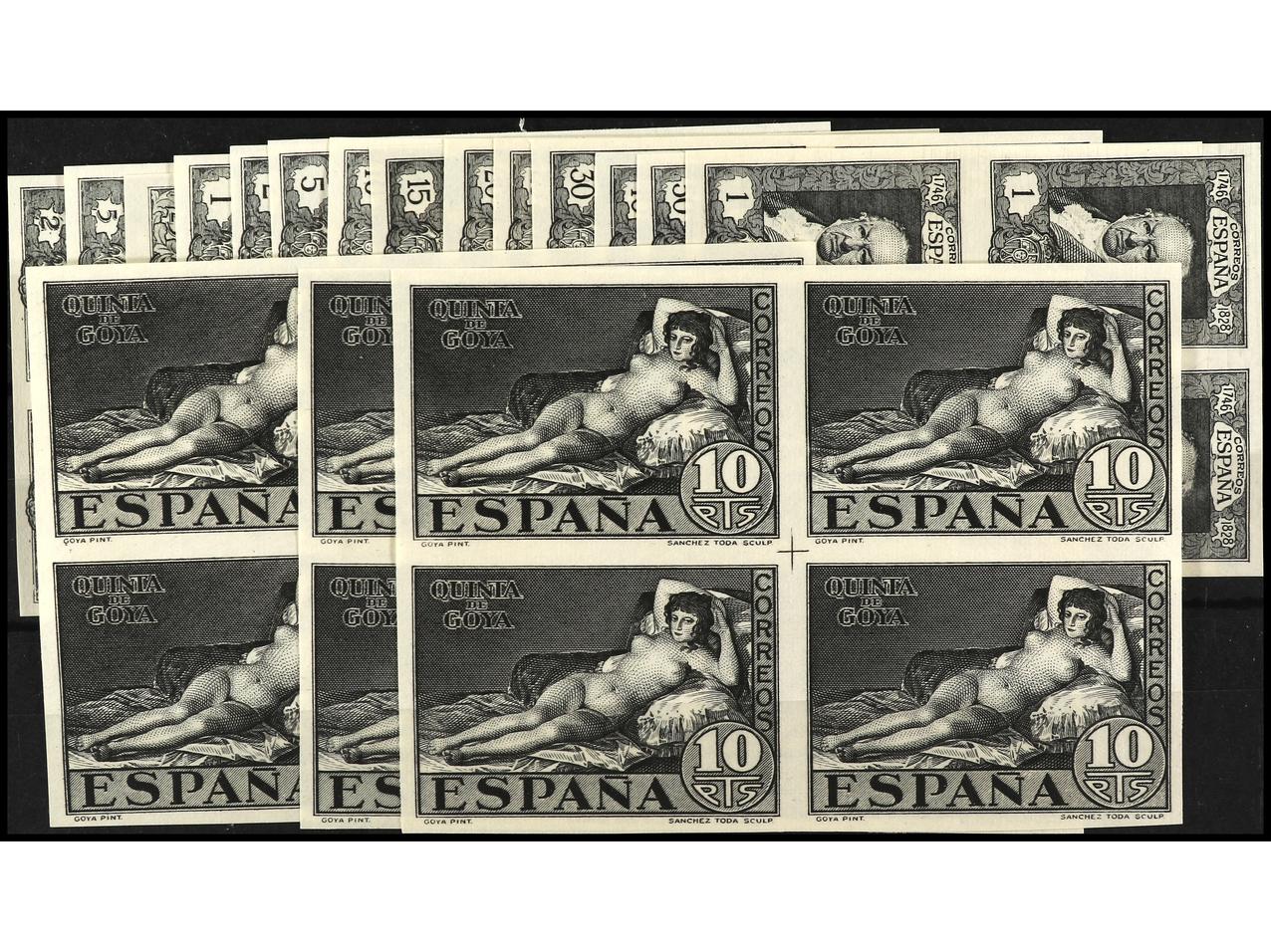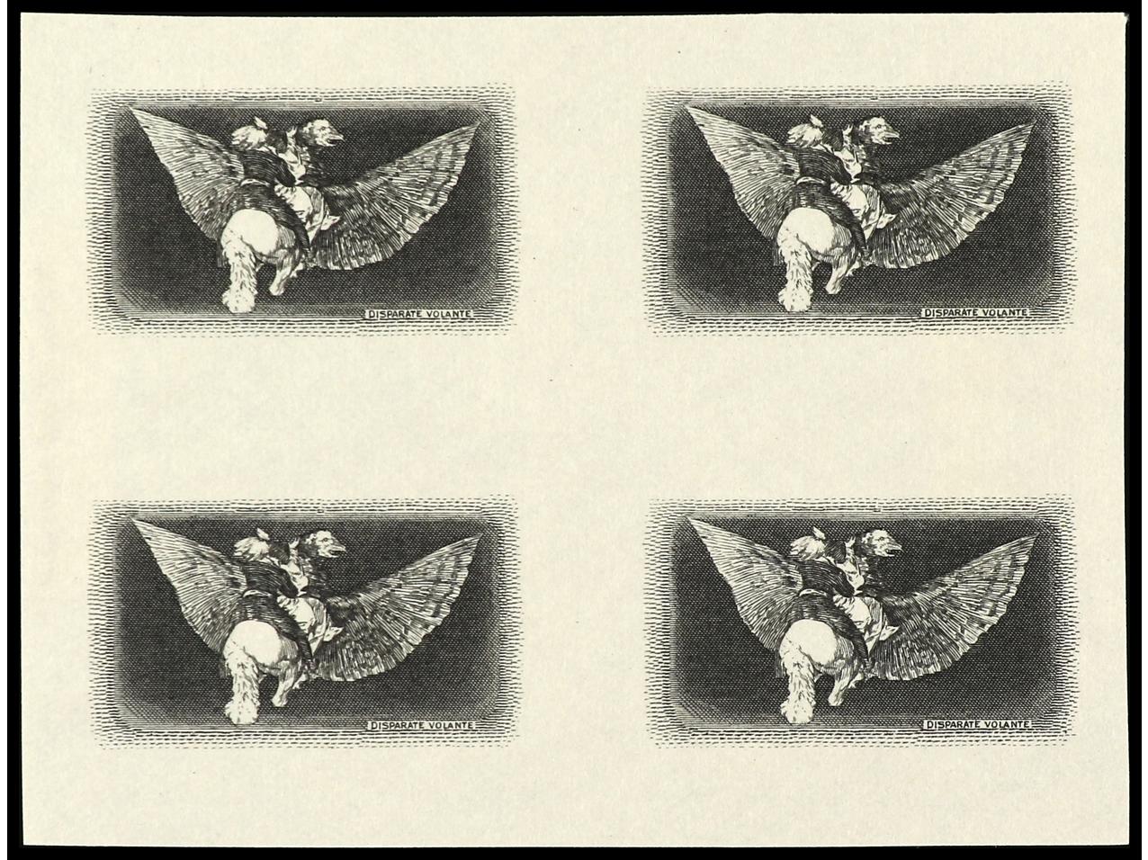 ESPAÑA. GOYA. ENSAYOS DE PLANCHA. Juego completo 17 valores en negro en bloques de cuatro (Gálvez 2616/8 y 2622/31 más valores de 1, 4 y 10 pts. no reseñados).