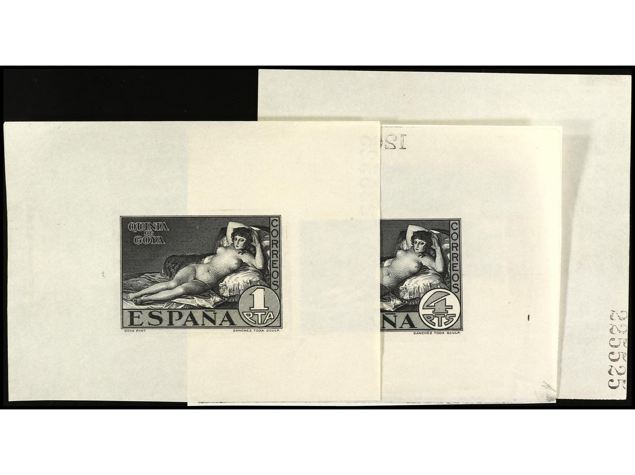 ESPAÑA. GOYA. PRUEBAS DE PUNZÓN. 3 pruebas de 1 pta., 4 pts. y 10 pts. en negro. (Gálvez 2610/12). (Image1) (Image2)