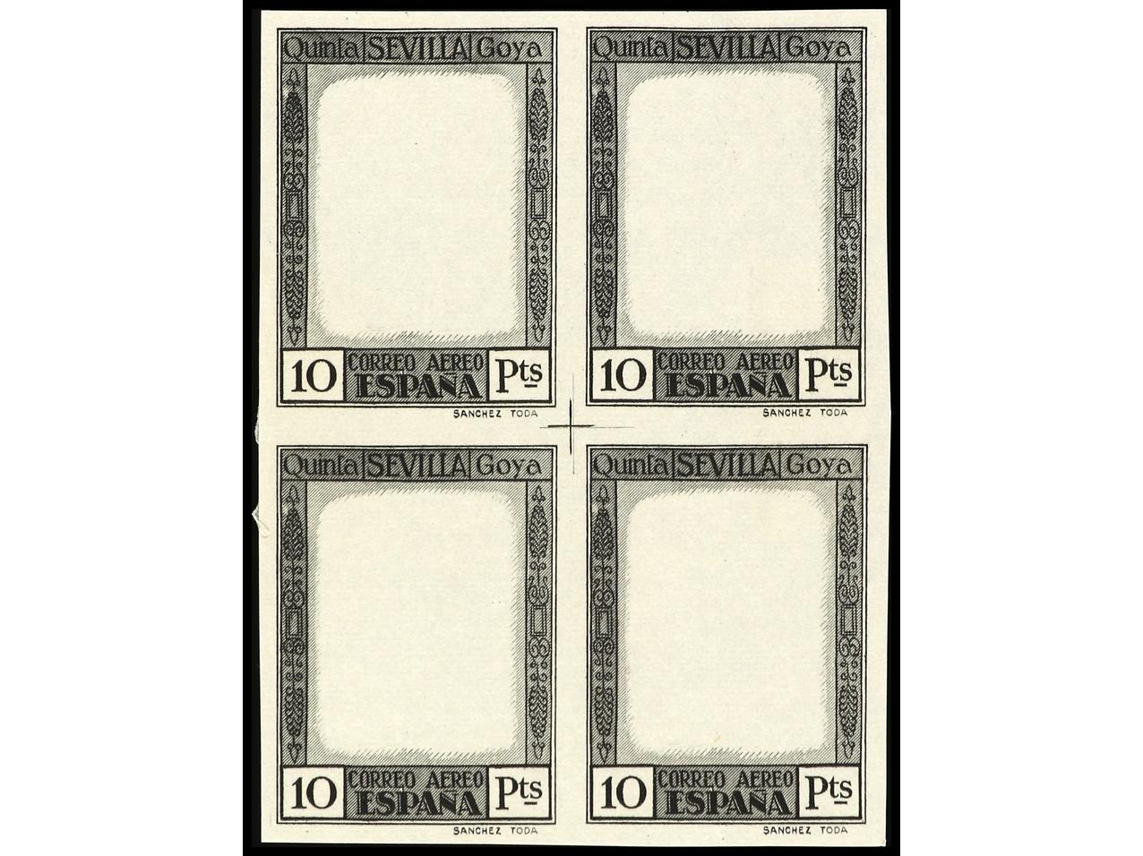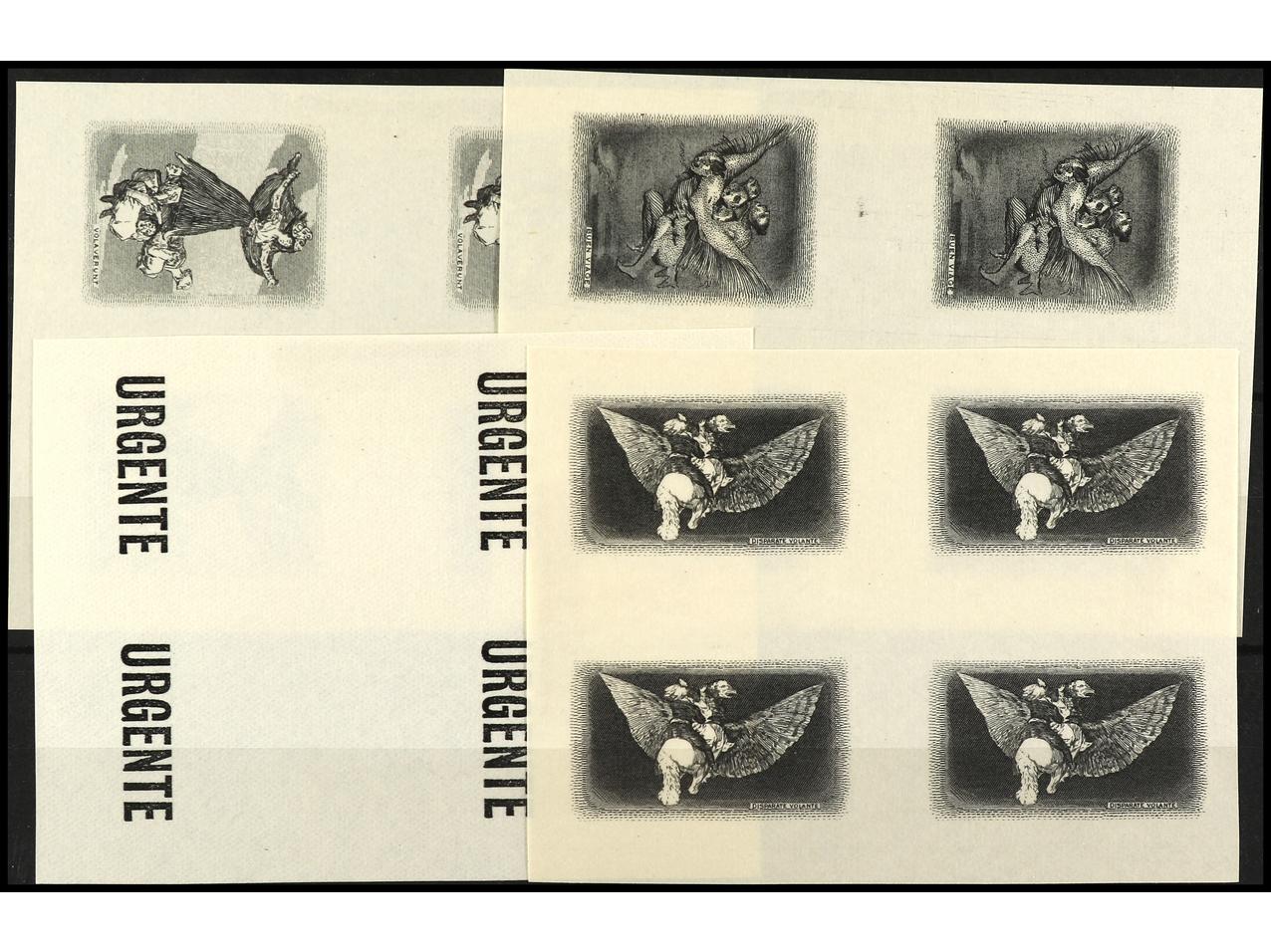 ESPAÑA. GOYA. CORREO AÉREO. ENSAYOS DE PLANCHA. 3 centros y con las palabra URGENTE solamente. Bloques de cuatro (Gálvez CA 200/03). (Image1) (Image2)