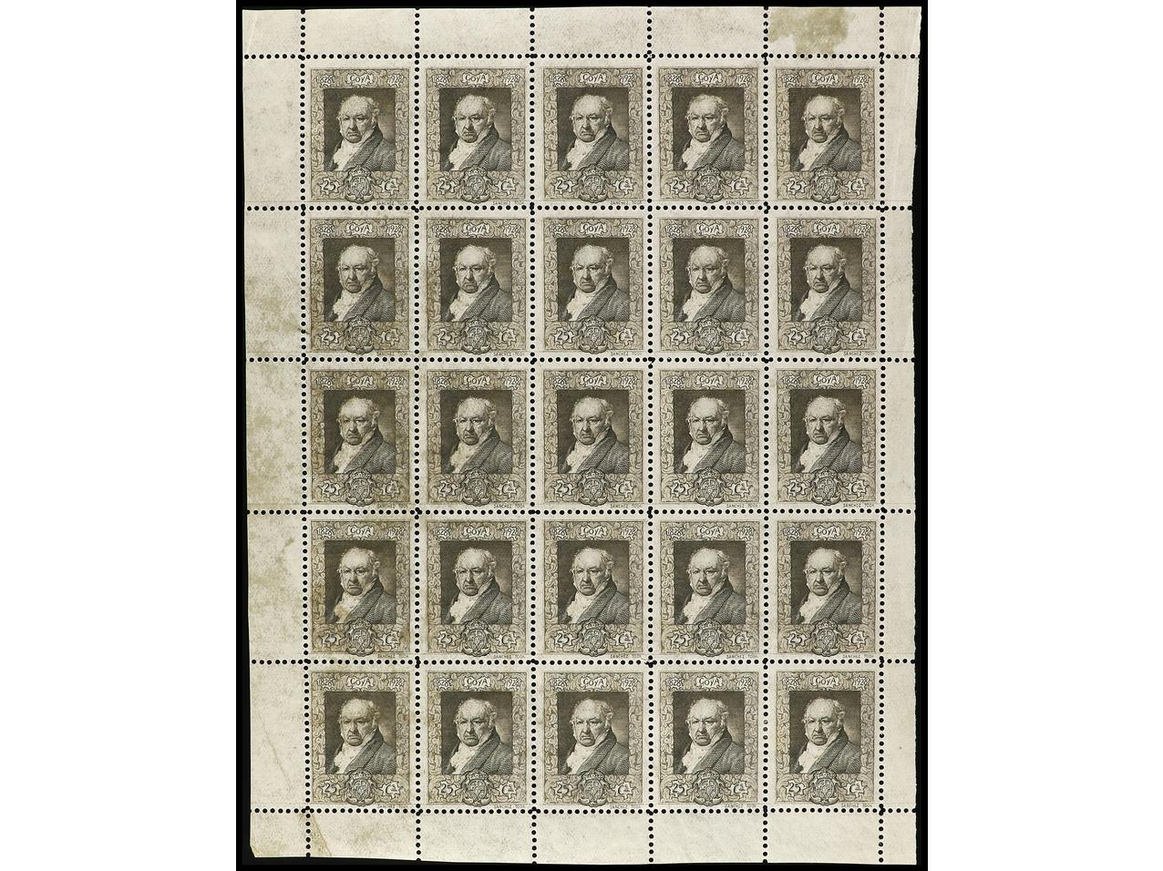 ESPAÑA. GOYA. ENSAYO DE PLANCHA. 25 cts. castaño en pieza de 25 sellos con dent. 10. Muy raro y no reseñado ensayo de dentado. MUY RARO. (Image1)