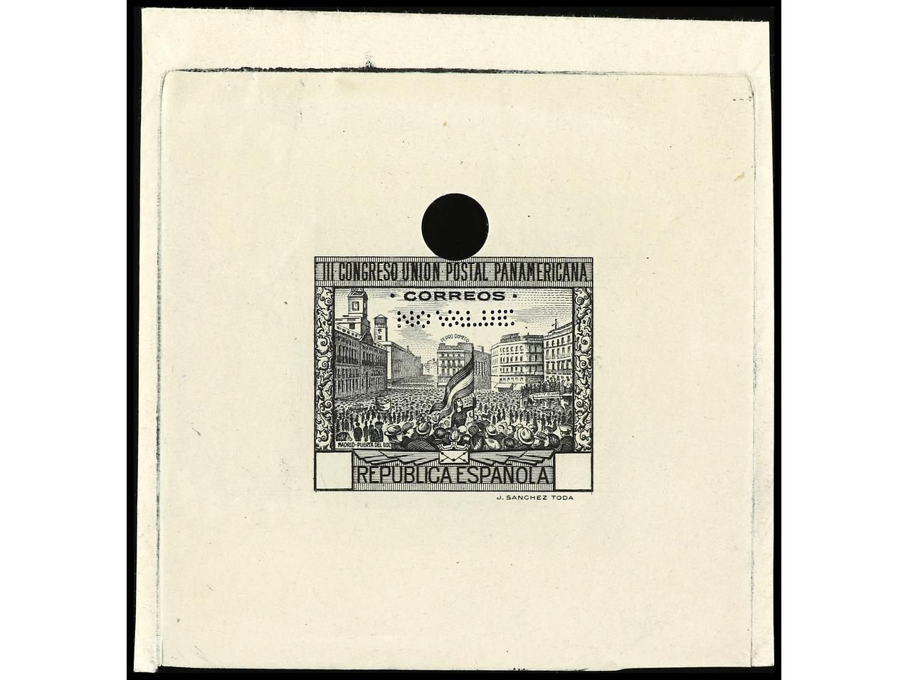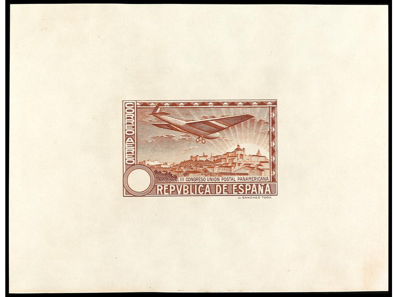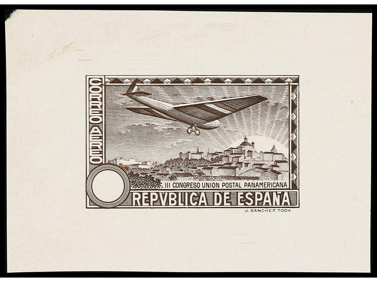 ESPAÑA. UNIÓN POSTAL PANAMERICANA. CORREO AÉREO. PRUEBA DE PUNZÓN sin el valor en color castaño negro sobre papel estucado. RARA. (Gálvez CA 423).