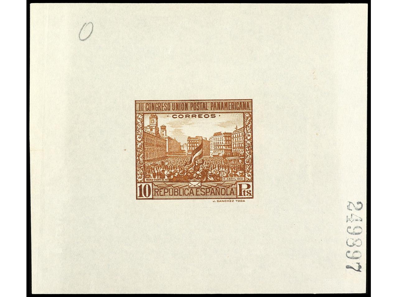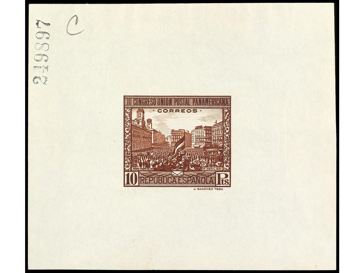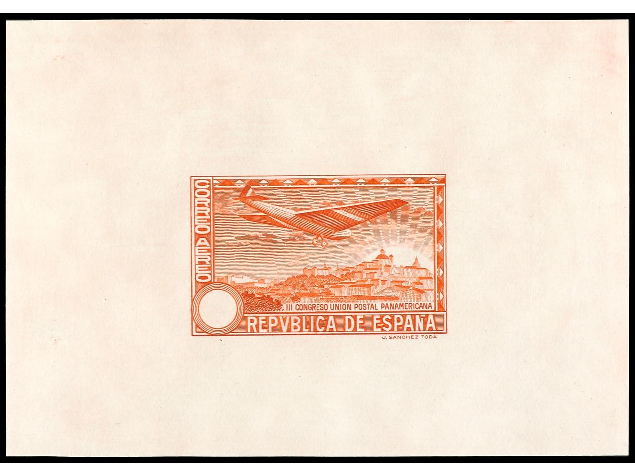 ESPAÑA. UNIÓN POSTAL PANAMERICANA. CORREO AÉREO. PRUEBA DE PUNZÓN sin el valor en color castaño negro sobre papel estucado. RARA. (Gálvez CA 423).