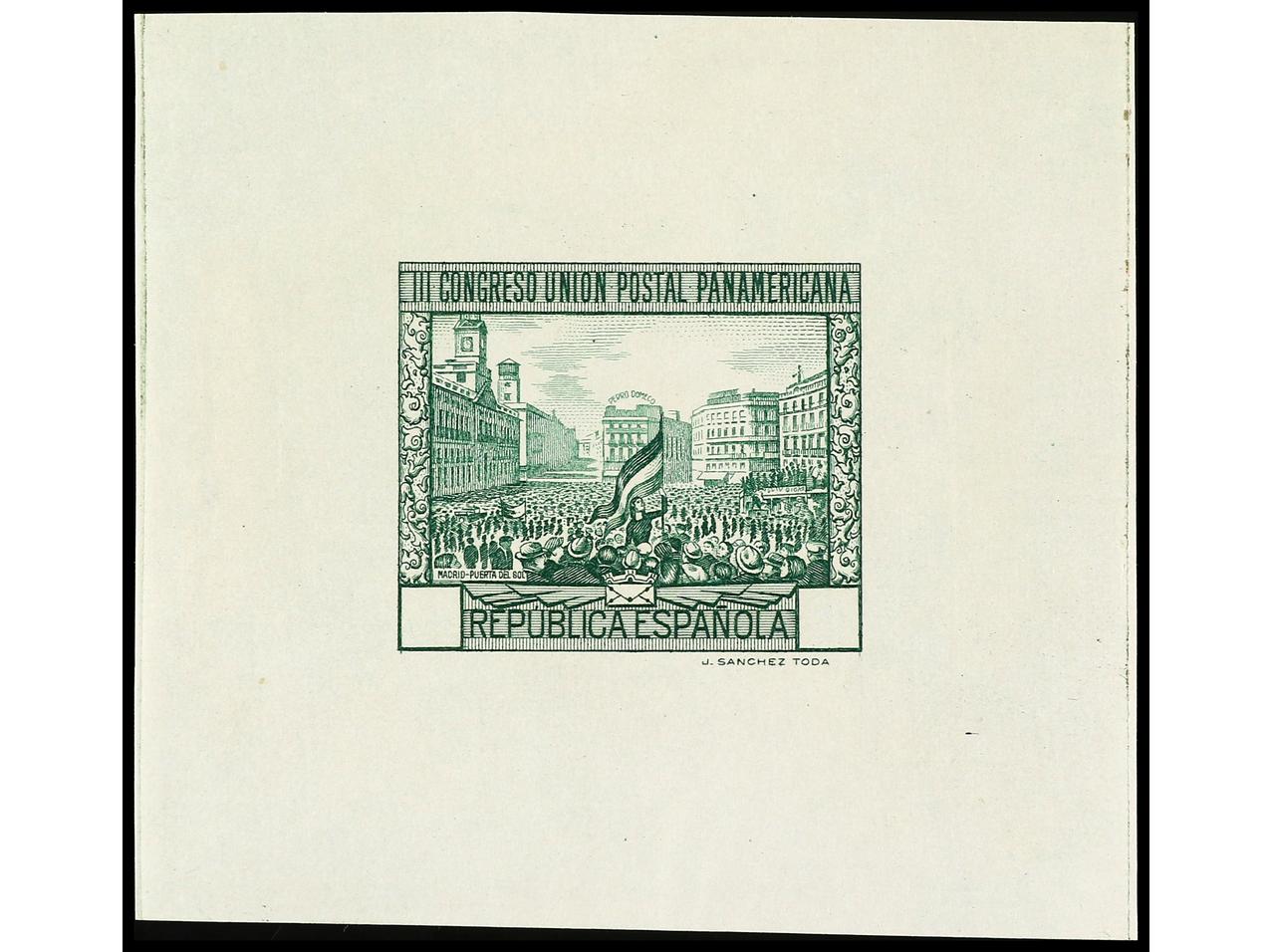 ESPAÑA. UNIÓN POSTAL PANAMERICANA. PRUEBA DE PUNZÓN sin el valor indicado en color verde. RARA. (Gálvez 2865). (Image1)