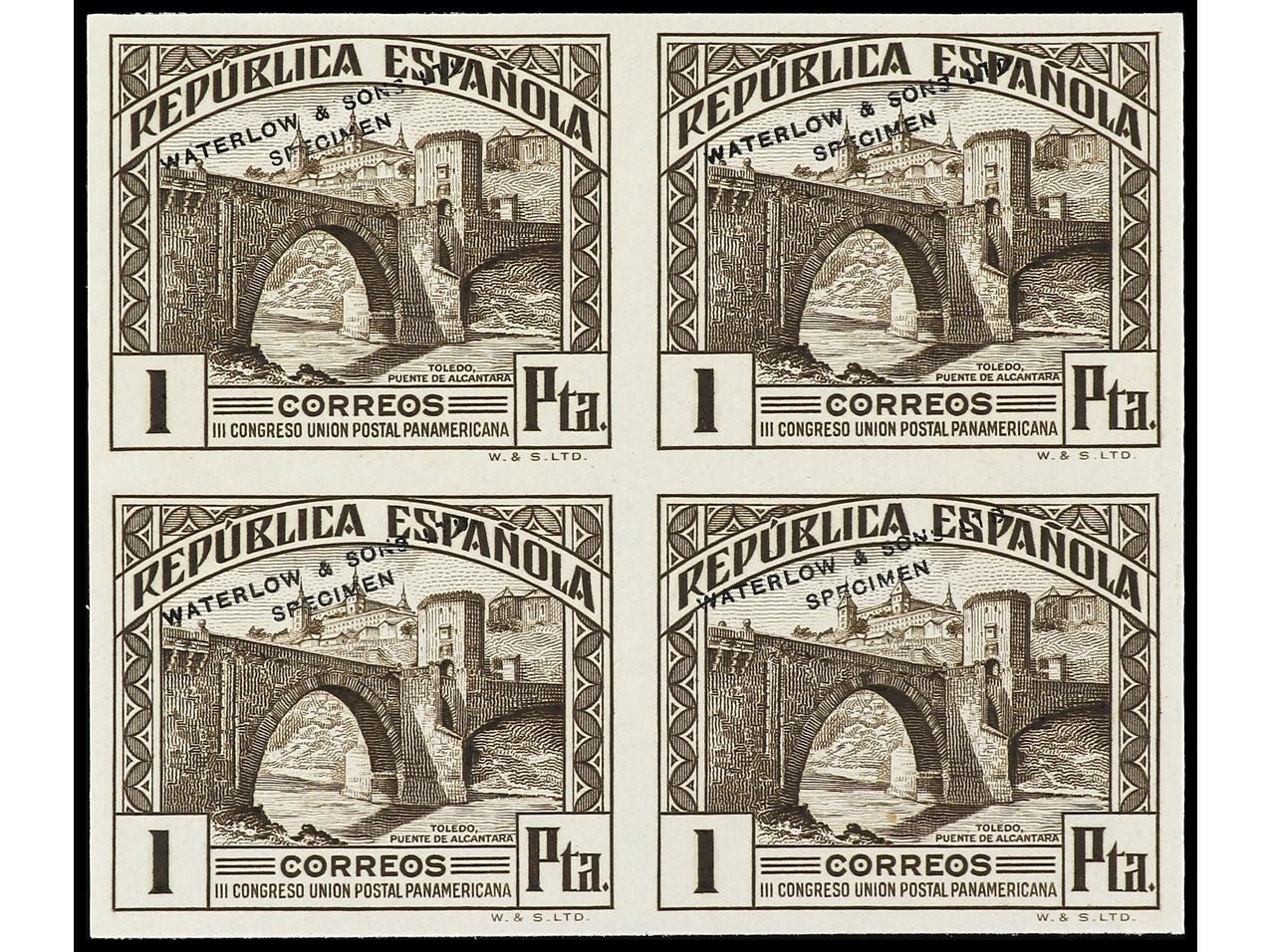 ESPAÑA. UNIÓN POSTAL PANAMERICANA. MUESTRAS. 1 pta. castaño sin dentar con habilitación WATERLOW AND SONS LTD./SPECIMEN en bloque de cuatro. (Gálvez 2924).