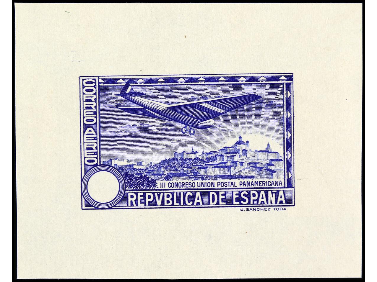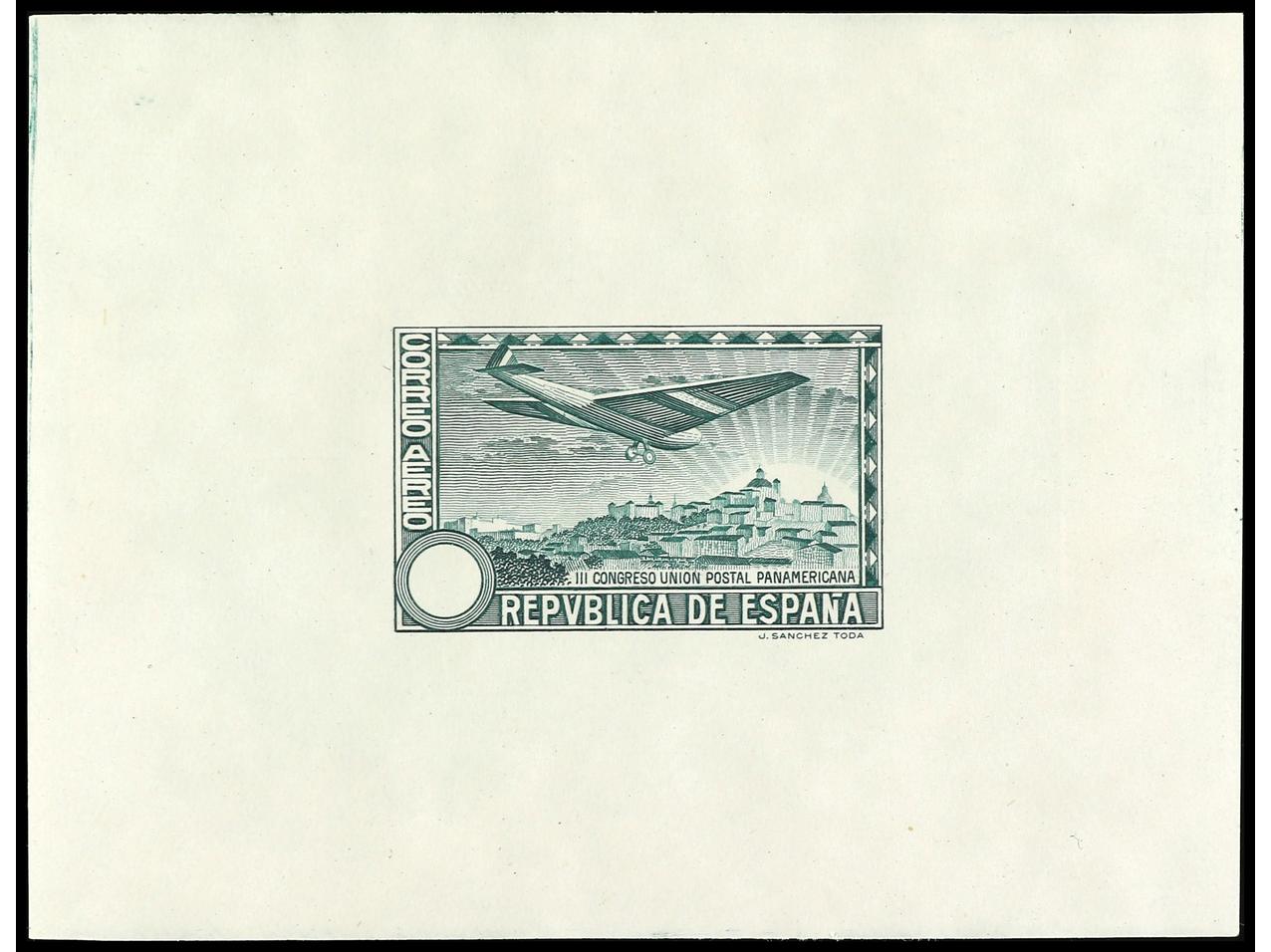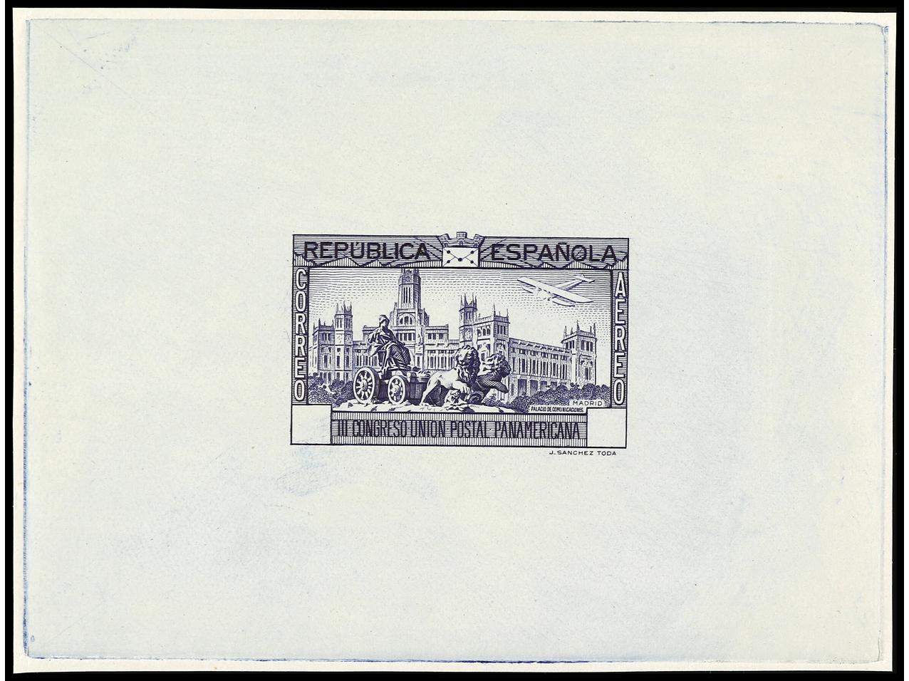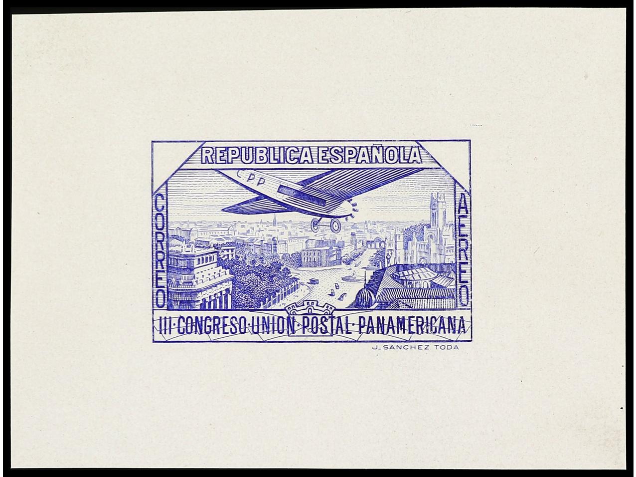 ESPAÑA. UNIÓN POSTAL PANAMERICANA. CORREO AÉREO. PRUEBA DE PUNZÓN grabado sin terminar en color azul sobre papel estucado. RARA. (Gálvez CA 432).