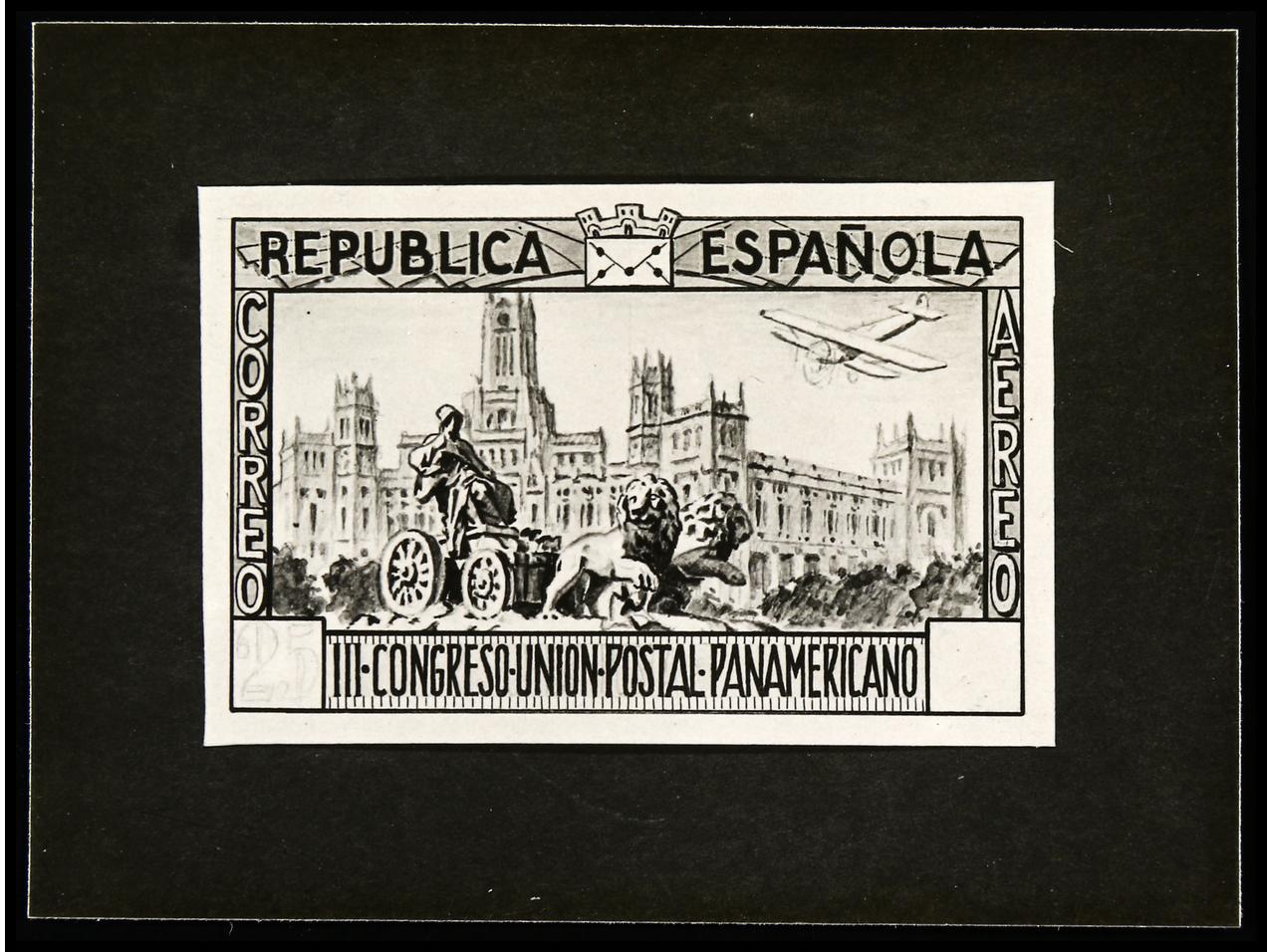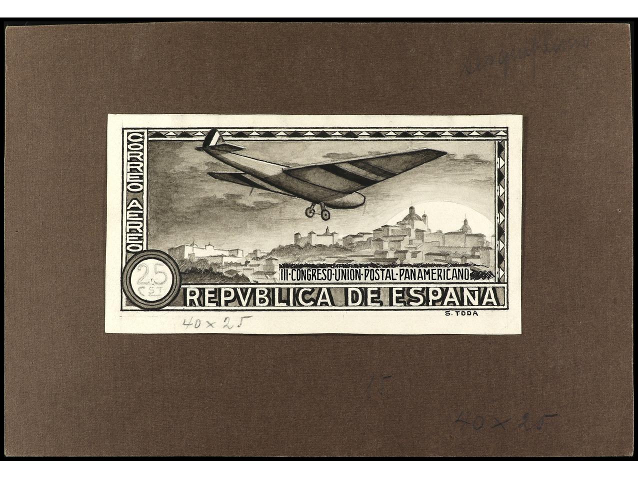 ESPAÑA. UNIÓN POSTAL PANAMERICANA. CORREO AÉREO. Diseño original realizado en lápiz y tinta china para el sello de 25 cts. ÚNICO. (Image1)
