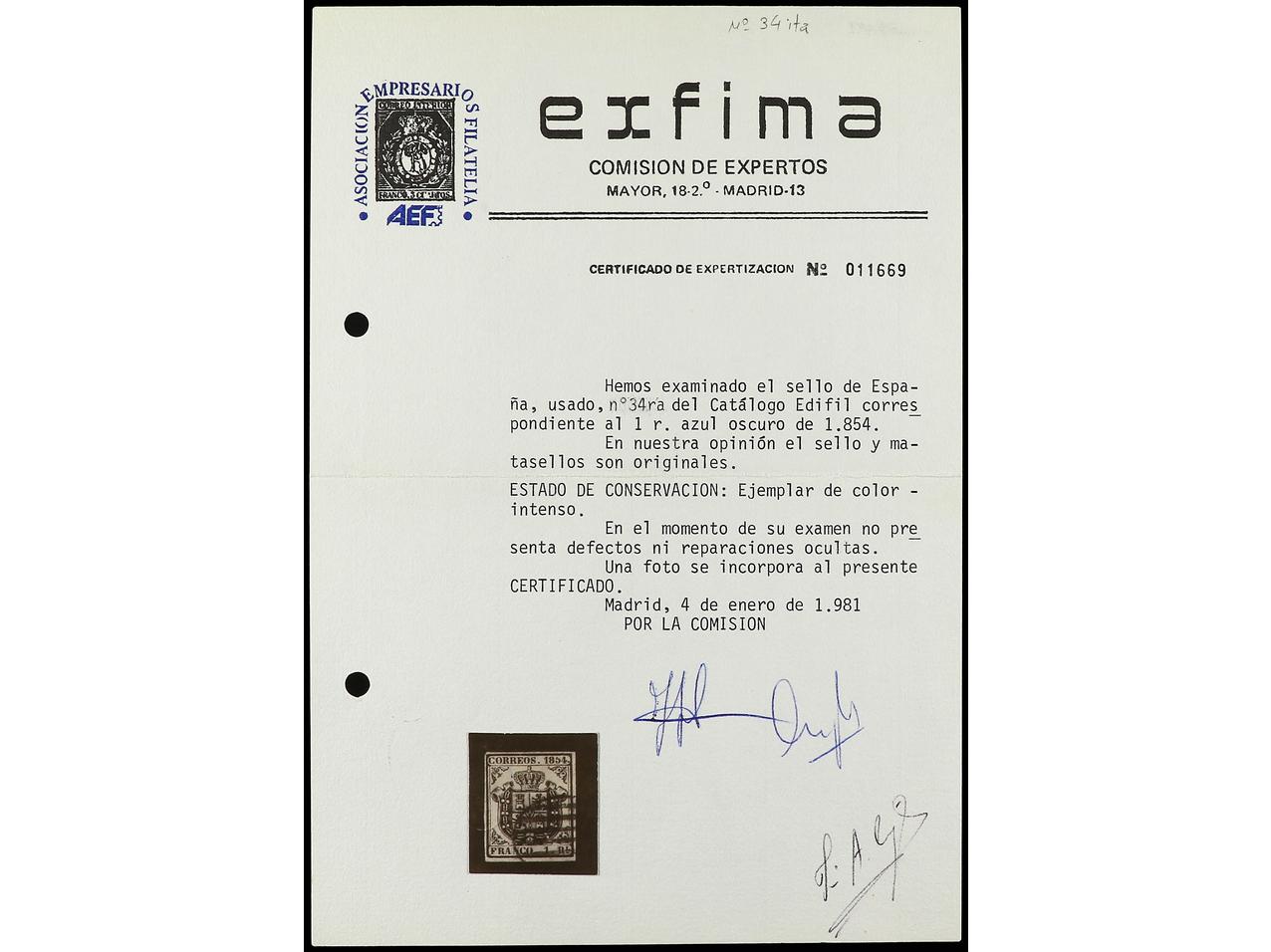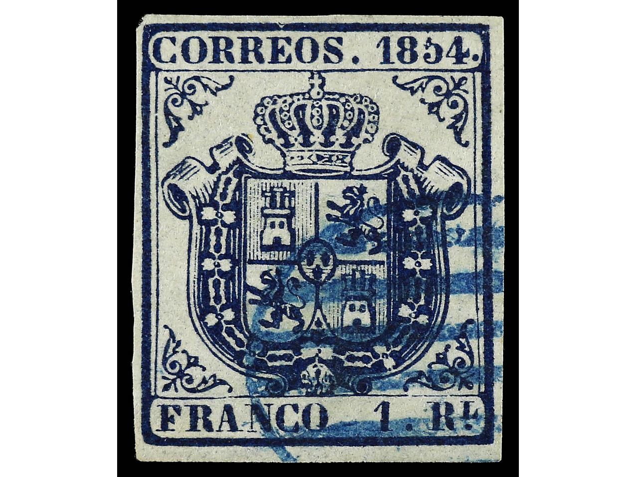 ESPAÑA. 1 real azul oscuro. Mat. parrilla azul. ´5´ de ´1854´ sin la parte superior. RARO. Cert. EXFIMA. Ed.34ita. Cat. 775€. (Image1) (Image2)