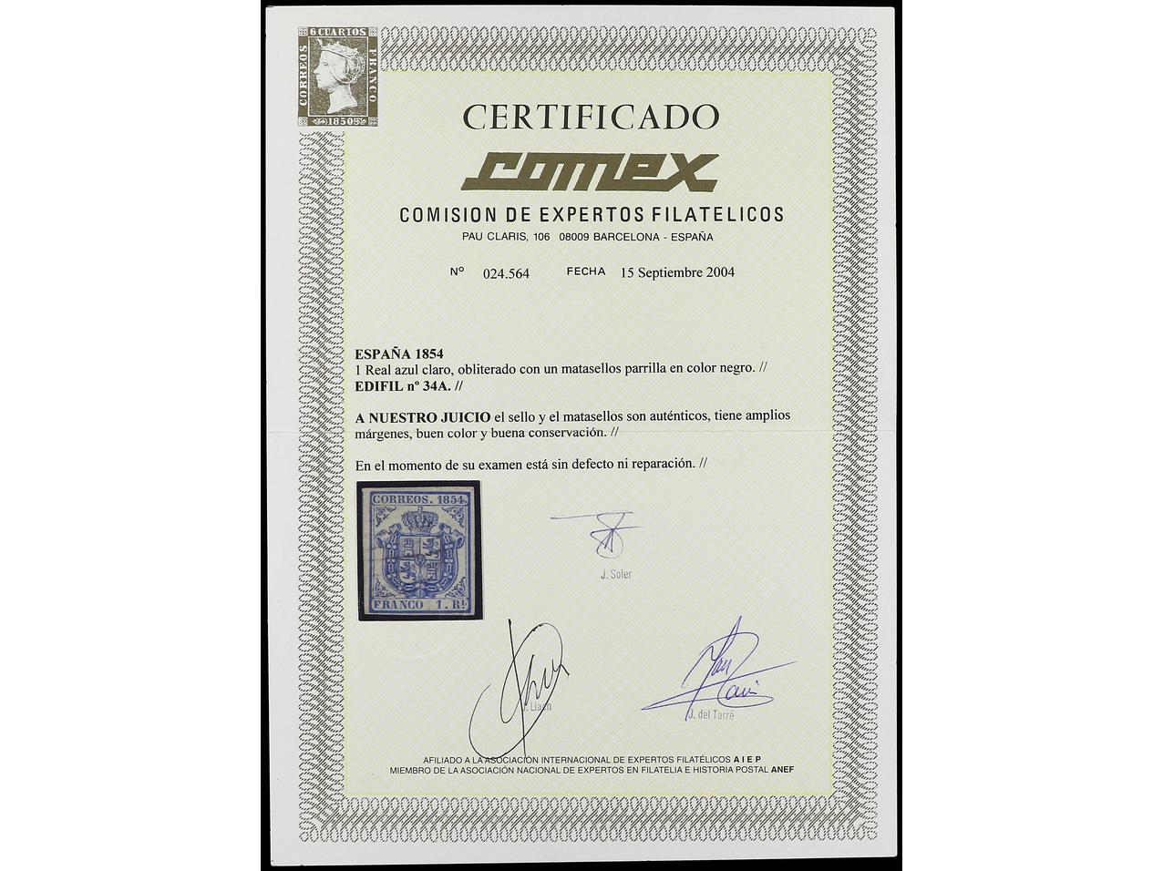 ESPAÑA. 1 real azul claro. Amplios márgenes y fino matasellos. PIEZA DE LUJO. Cert. COMEX. Ed.34A. (Image1) (Image2)