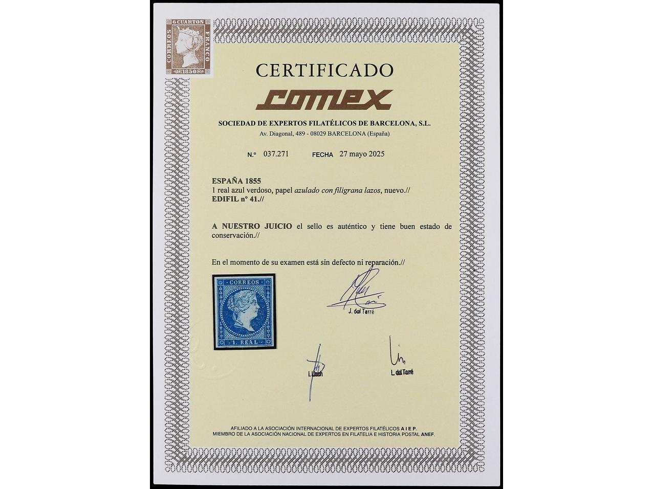ESPAÑA. 1 real azul verdoso. MAGNÍFICO EJEMPLAR. Cert. COMEX. Ed.42. Cat. 250€. (Image1) (Image2)