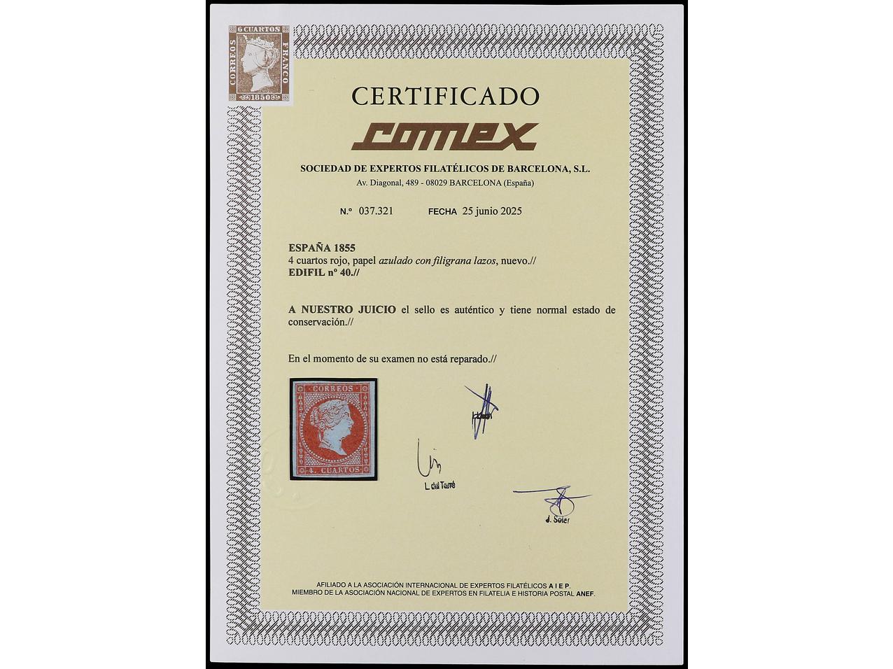 ESPAÑA. 4 cuartos rojo. PIEZA DE LUJO. Cert. COMEX. Ed.40. Cat. 350€. (Image1) (Image2)