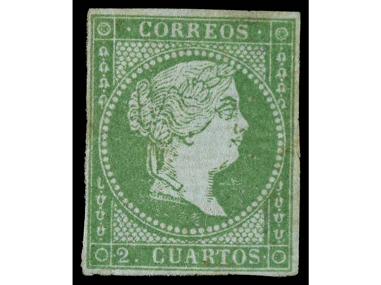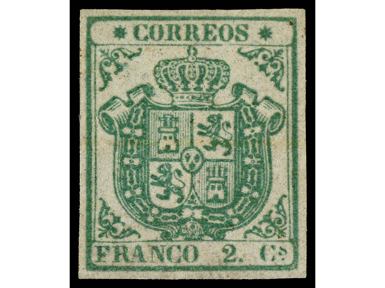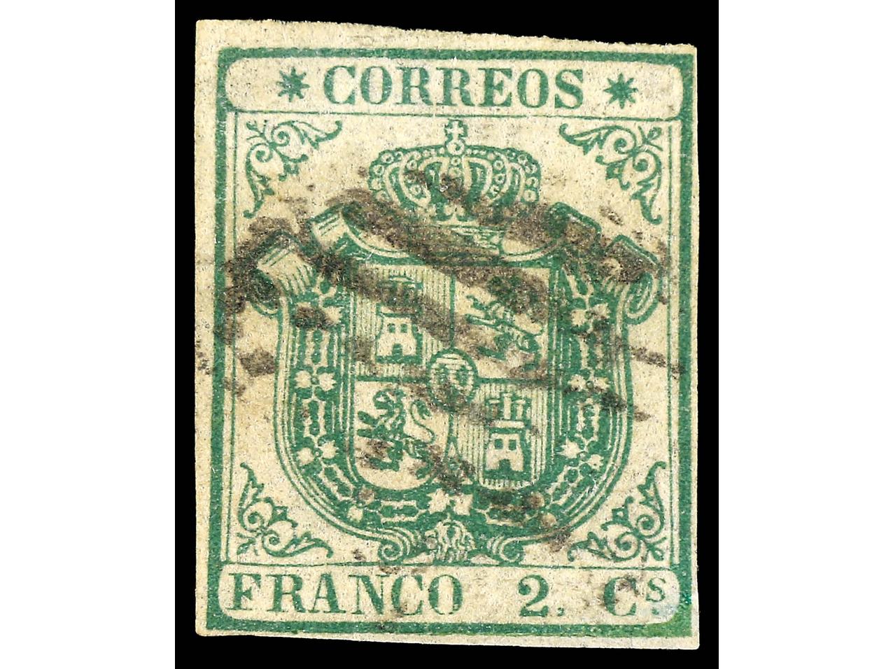 ESPAÑA. 2 cuartos verde, ´puntas finas´. Márgenes completos. Buen ejemplar. Cert. COMEX. Ed.32A. Cat. 1.800€. (Image1) (Image2)