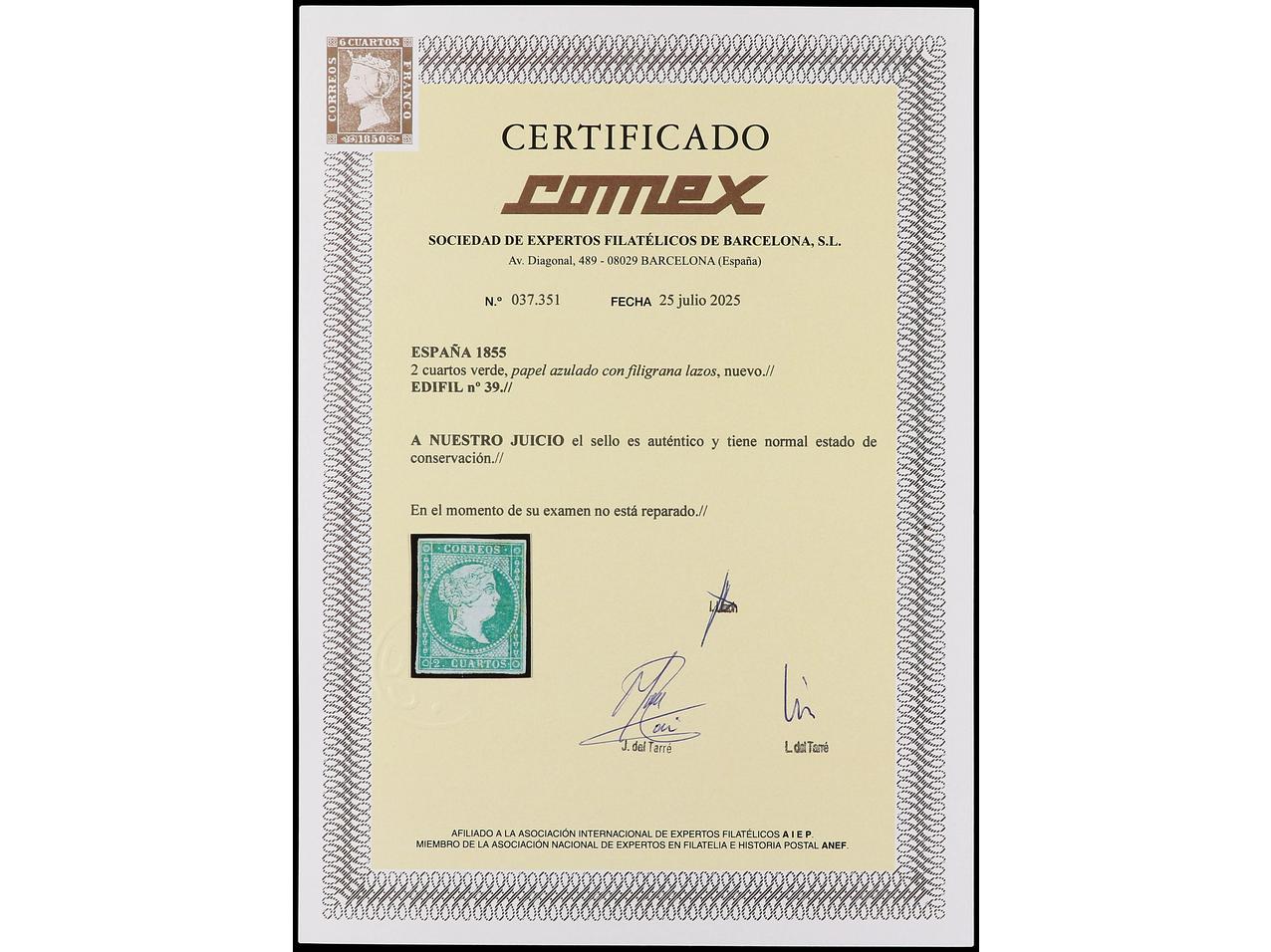 ESPAÑA. 2 cuartos verde. Color fresco y márgenes completos. Muy bonito ejemplar. Cert. COMEX. Ed.39. Cat. 2.400€. (Image1) (Image2)