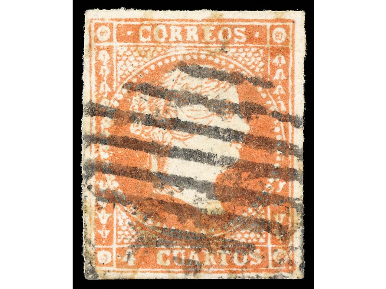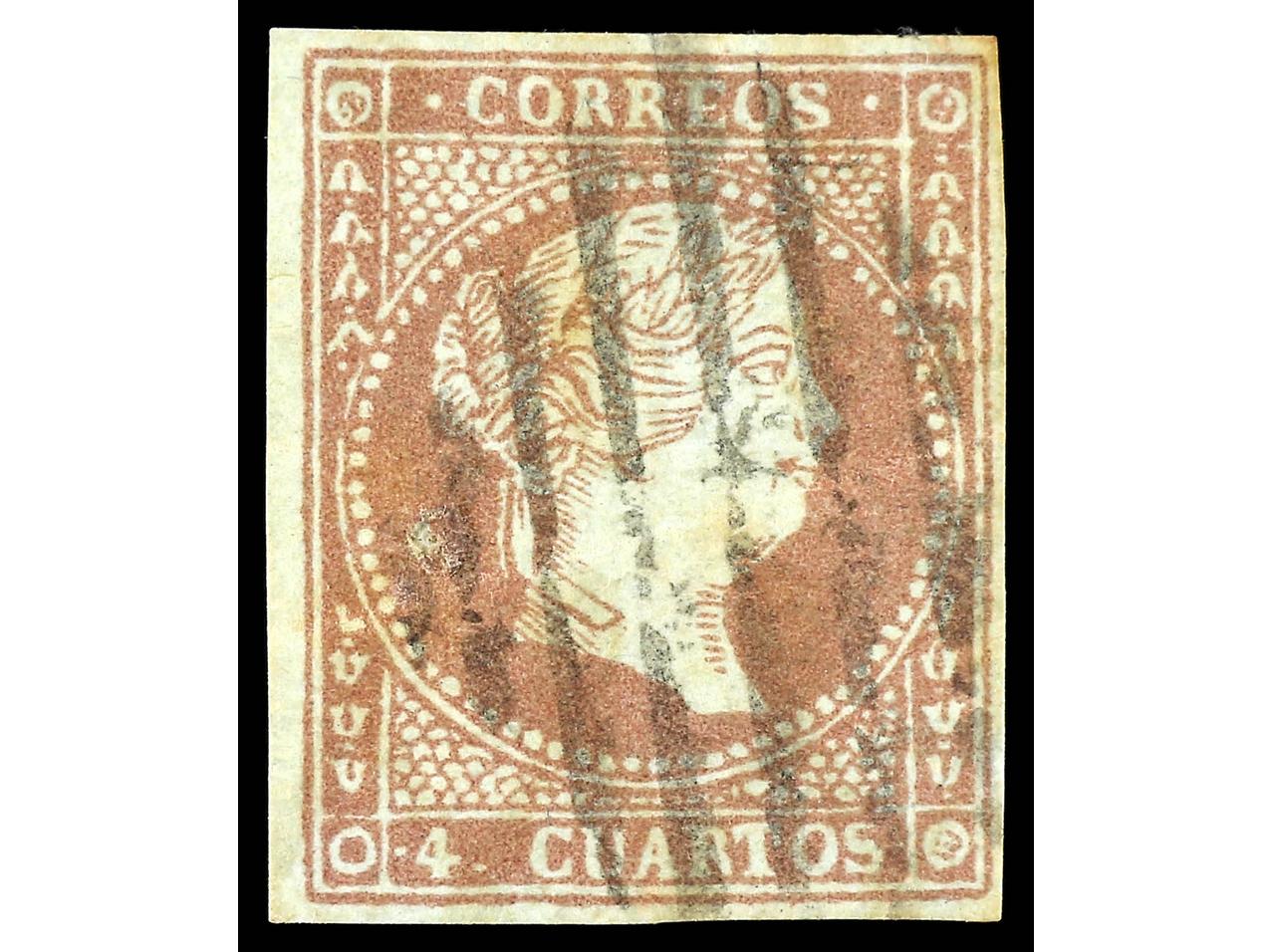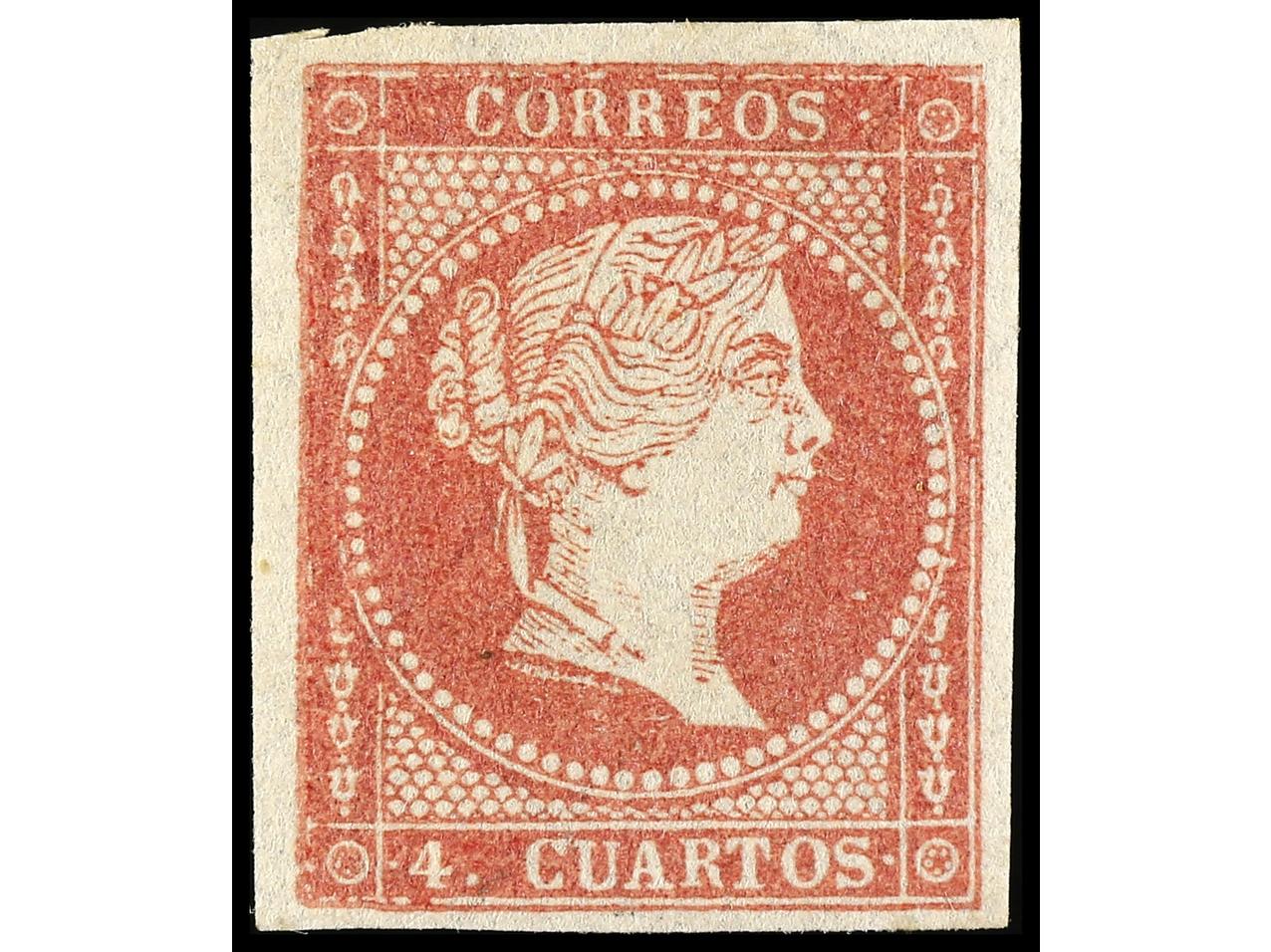ESPAÑA. 4 cuartos carmín s. papel azulado. PIEZA DE LUJO. Leve pliegue en ángulo inferior izquierdo. Ed.33A. Cat. 550€. (Image1) (Image2)