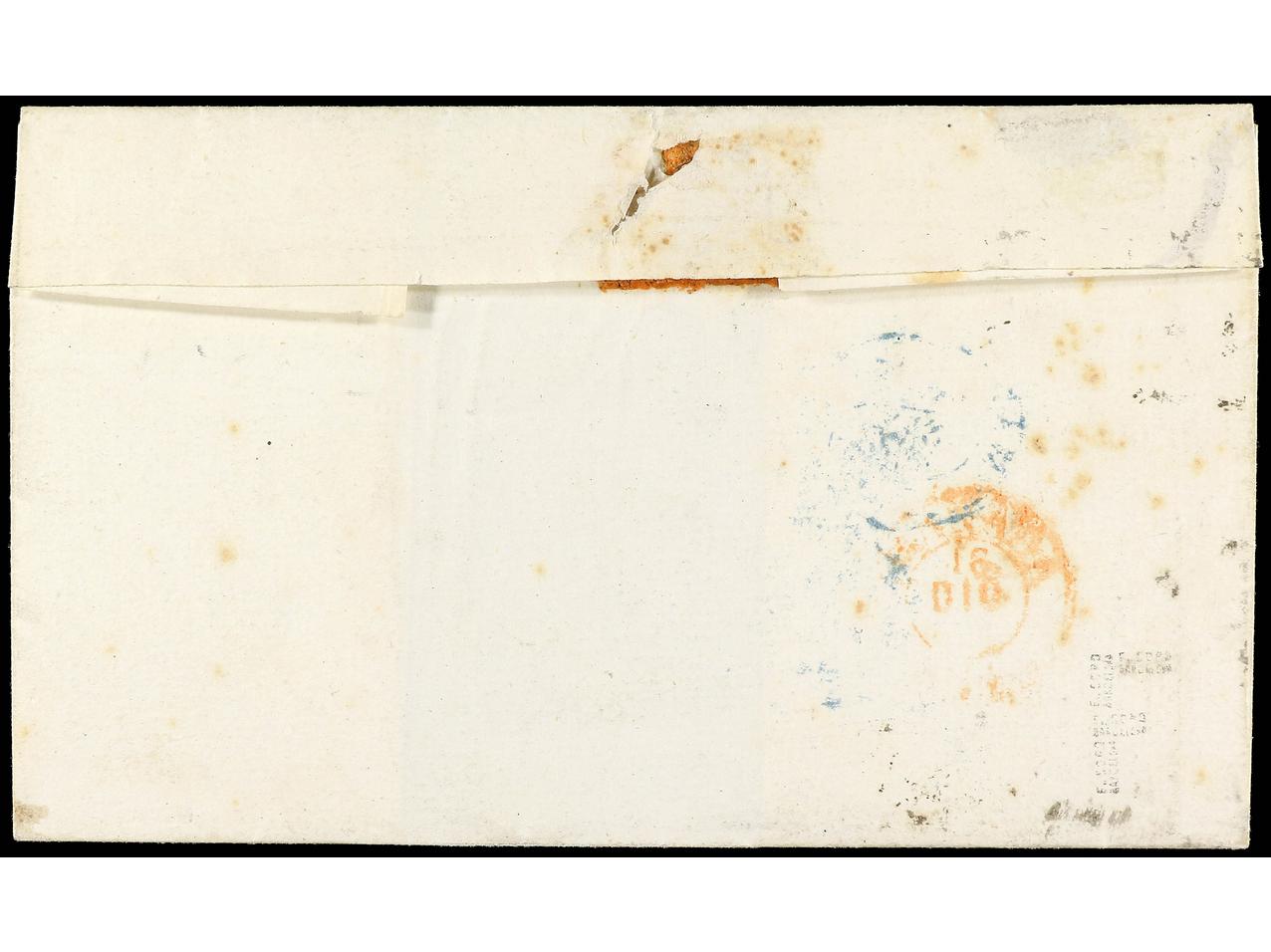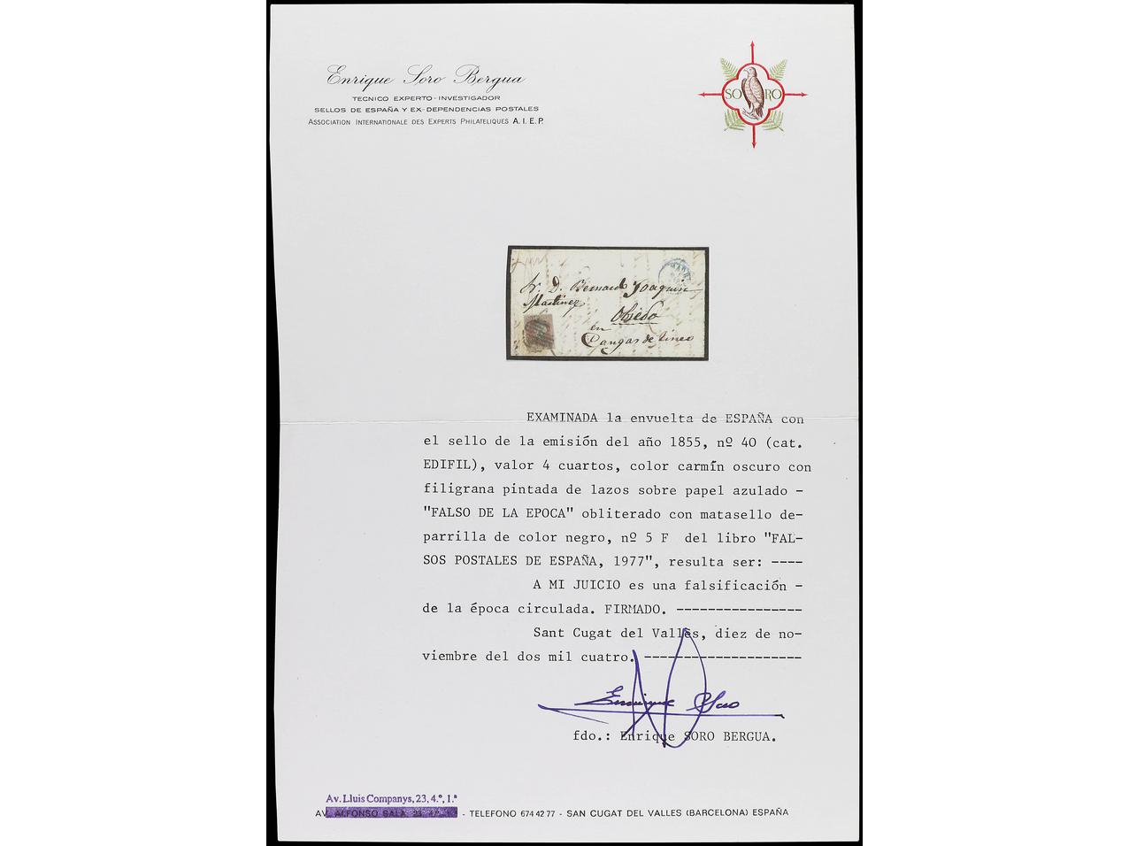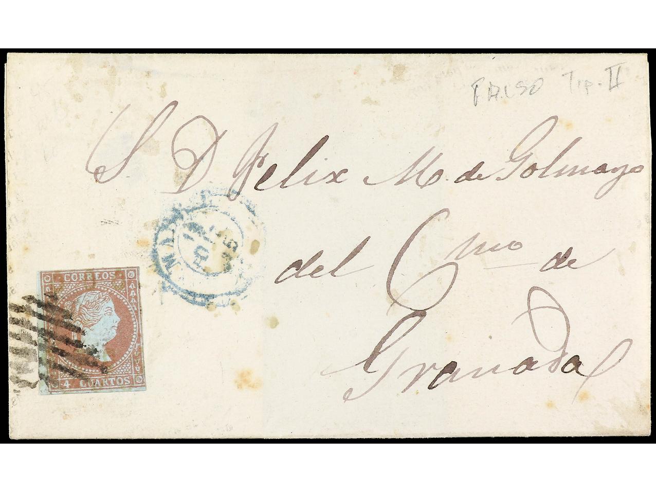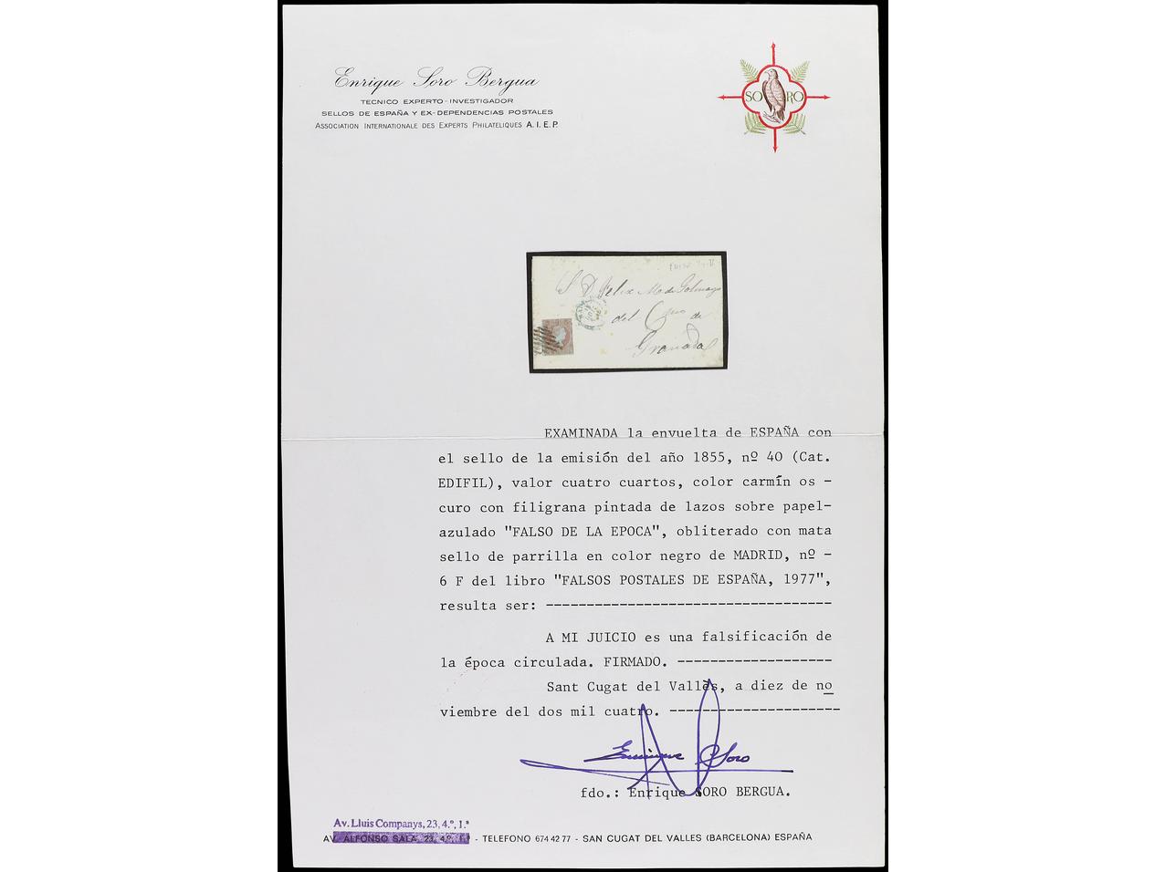 ESPAÑA. 1855. MADRID a GRANADA. 4 cuartos filigrana pintada, FALSO POSTAL. Graus-Soro 6F. Cert. SORO. Ed.40F. (Image1) (Image2)