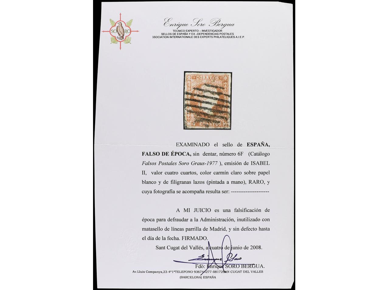 ESPAÑA. 4 cuartos FALSO POSTAL. Filigrana pintada. Graus-Soro 6F. Cert. SORO. Ed.40F. (Image1) (Image2)