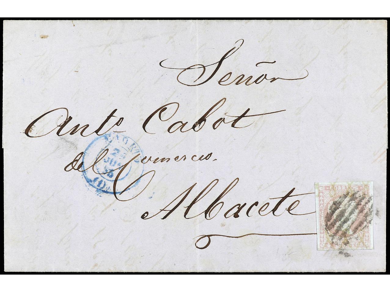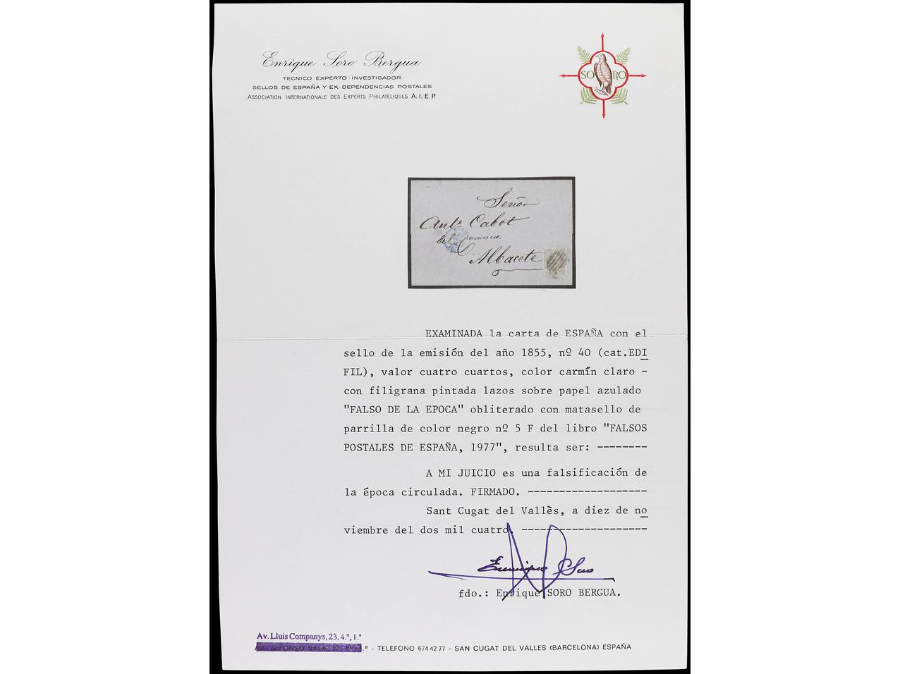 ESPAÑA. 1855. MADRID a ALBACETE. 4 cuartos FALSO POSTAL. Graus-Soro 5F. Cert. SORO. Ed.40F. (Image1) (Image2)
