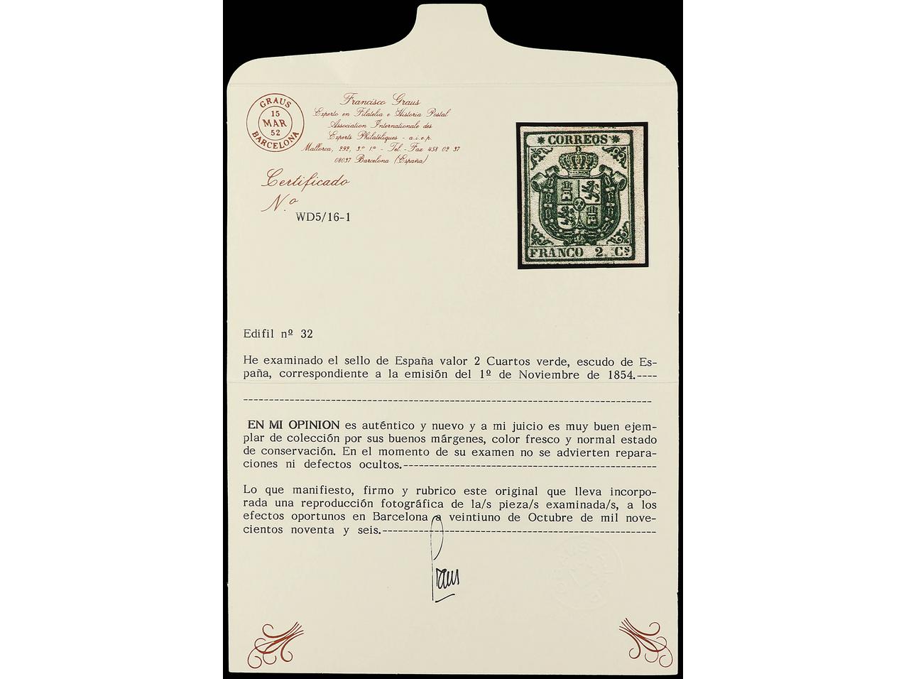 ESPAÑA. 2 cuartos verde. MAGNÍFICO EJEMPLAR. Cert. GRAUS. Ed.43. Cat. 4.725€. (Image1) (Image2)