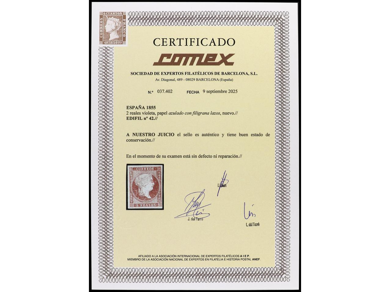 ESPAÑA. 2 reales violeta, un margen ajustado. Muy buen ejemplar. Cert. COMEX. Ed.42. Cat. 700€. (Image1) (Image2)