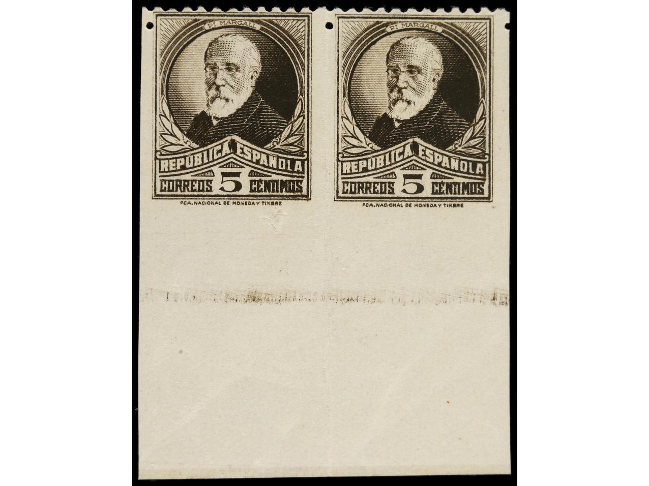 ESPAÑA. 5 cts. castaño. Pareja, borde de hoja DENTADO SOLO EN PARTE SUPERIOR. RARO y no reseñado. Ed.655 var. (2). (Image1)