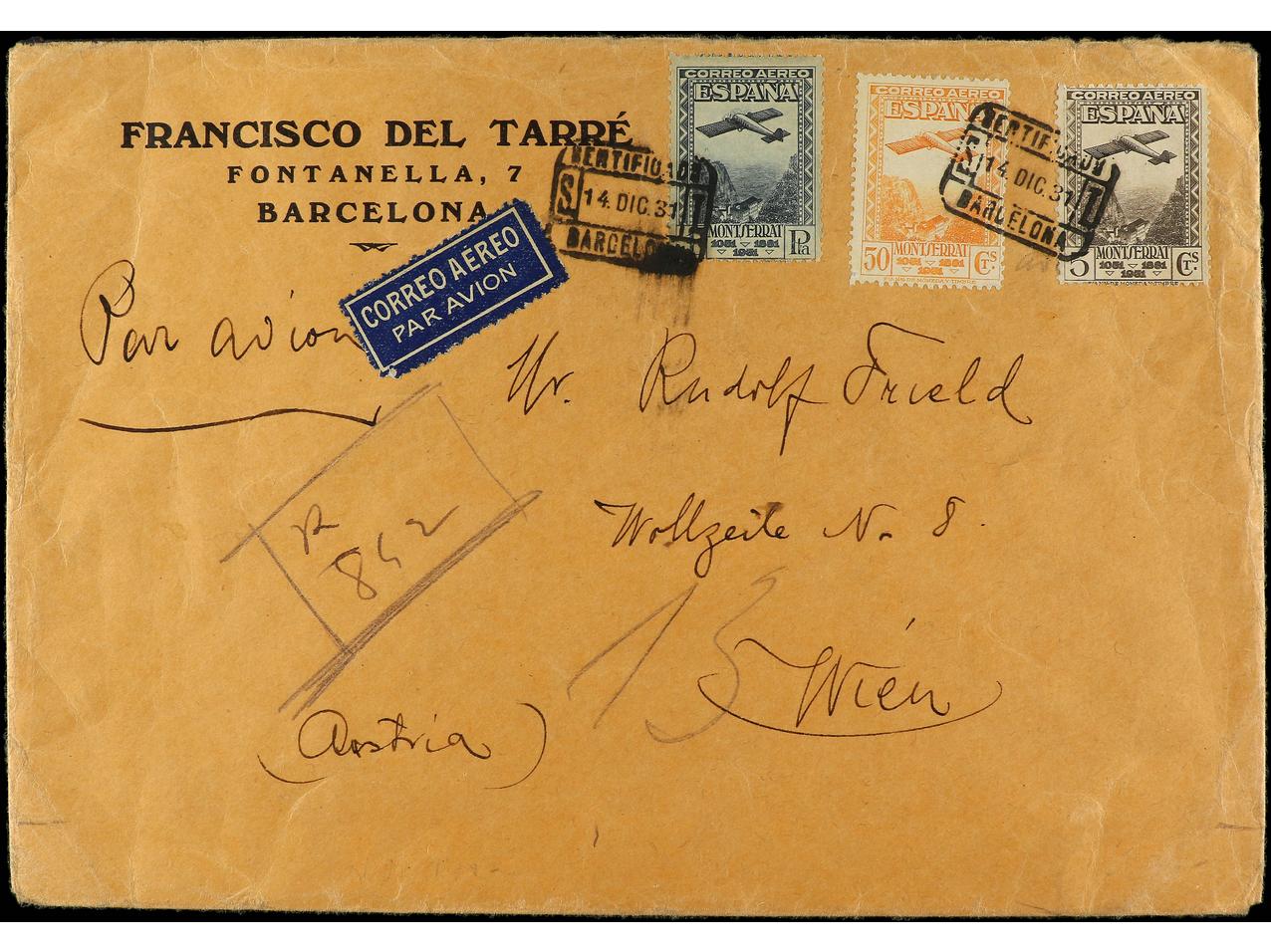 ESPAÑA. 1931. BARCELONA a VIENA. 5 cts. castaño, 50 cts. naranja y 1 pta. gris. Carta certificada, al dorso llegada. Ed.650, 653, 654. (Image1) (Image2)