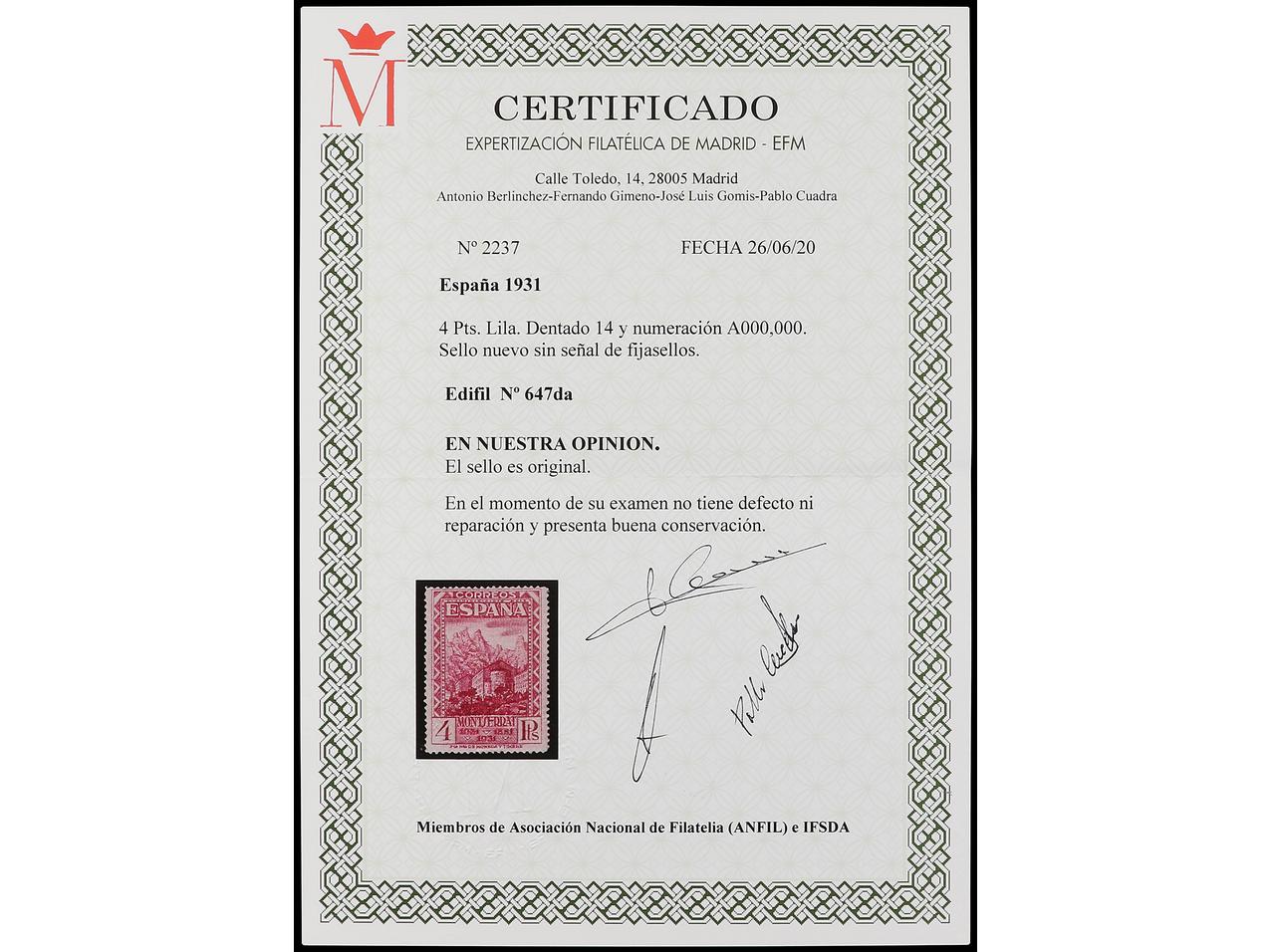 ESPAÑA. 4 pts. lila. Dentado 14 y numeración A 000,000. MAGNÍFICO y RARO. Se incluye ** 649d. Ed.647da. Cat. +800€. (Image1) (Image2)
