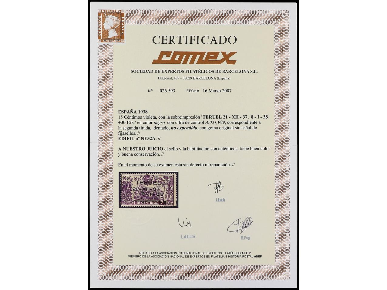 ESPAÑA. NO EXPENDIDO. +30 s. 15 cts. violeta, numeración A 031,999. Goma algo climatizada como es habitual en estos sellos. Cert. COMEX. Ed.NE 32A.