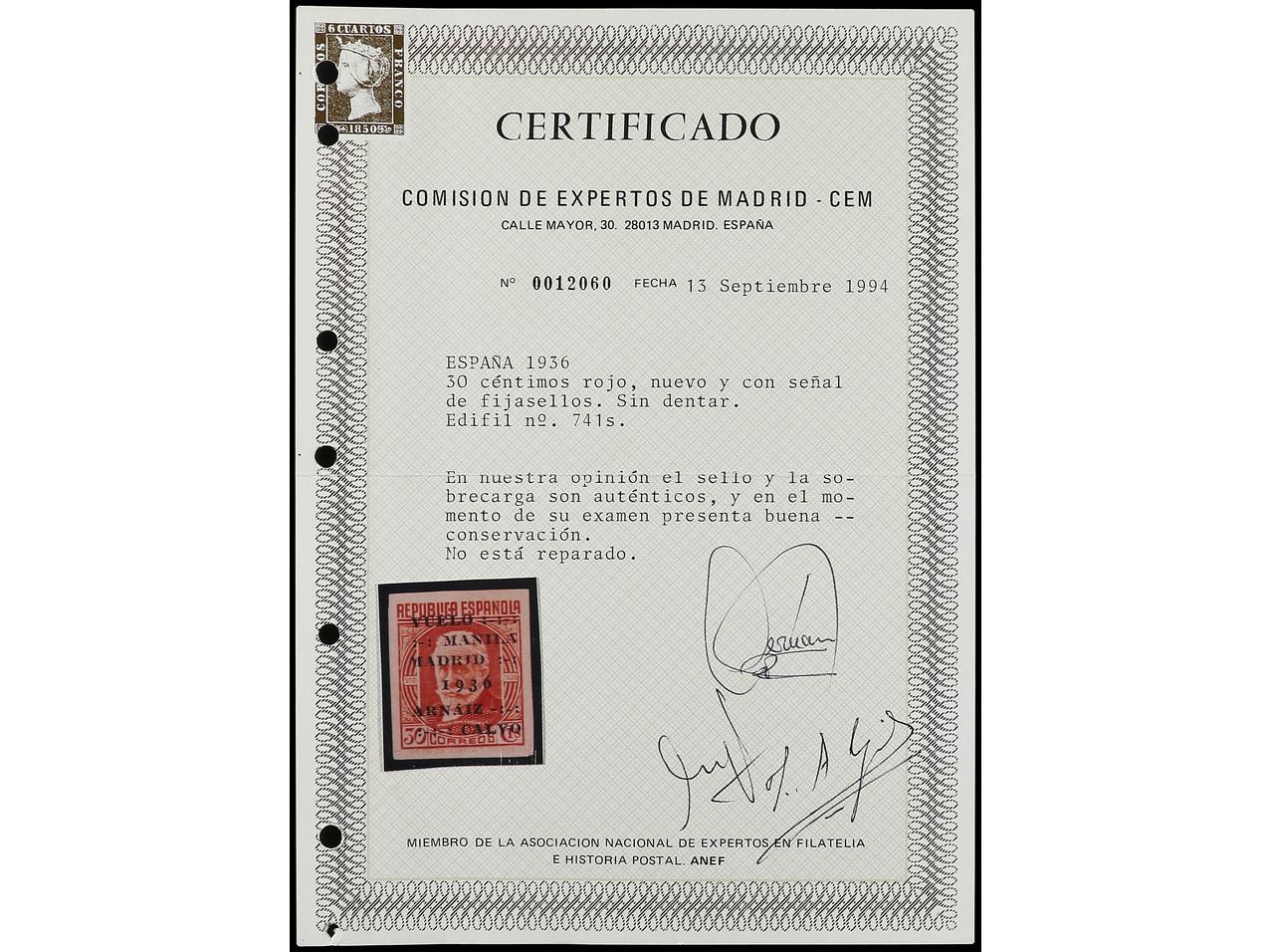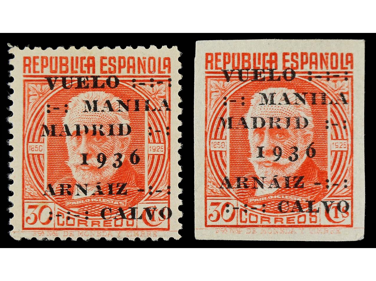 ESPAÑA. 30 cts. rojo SIN DENTAR (cert. CEM) y 30 cts. rojo DENTADO 14 de línea. Ed.741s y 741dp. Cat. 204€. (Image1) (Image2)