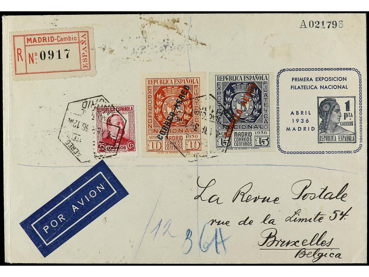 ESPAÑA. 1936. MADRID a BRUSELAS. Entero Postal de 1 pta. gris de la Expo. Filatélica con la serie completa de correo aéreo y sello de 25 cts. Rara verdaderamente circulada, al dorso llegada. Ed.729/30. (Image1) (Image2)