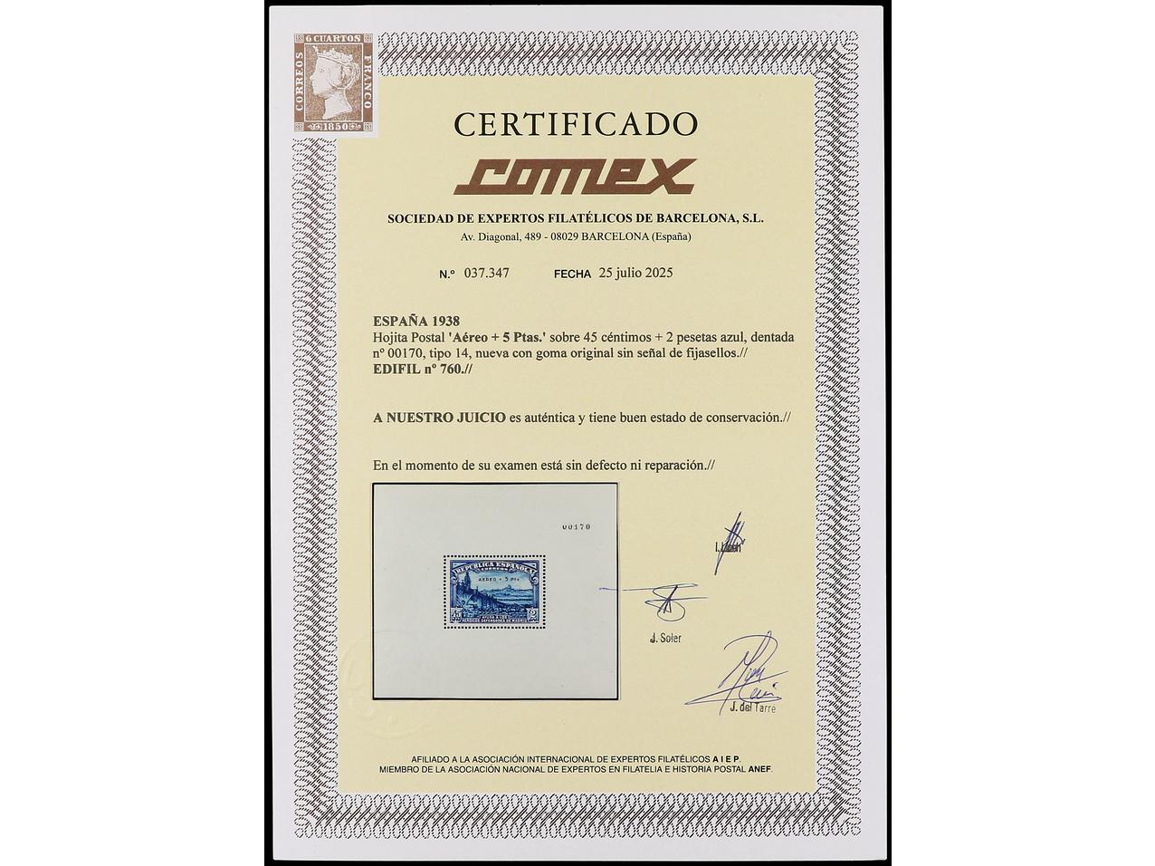 ESPAÑA. HB Aéreo + 5 pts. azul tipo 14. LUJO. MUY RARA EN ESTA CALIDAD. Cert. COMEX. Ed.760. Cat. 6.500€. (Image1) (Image2)