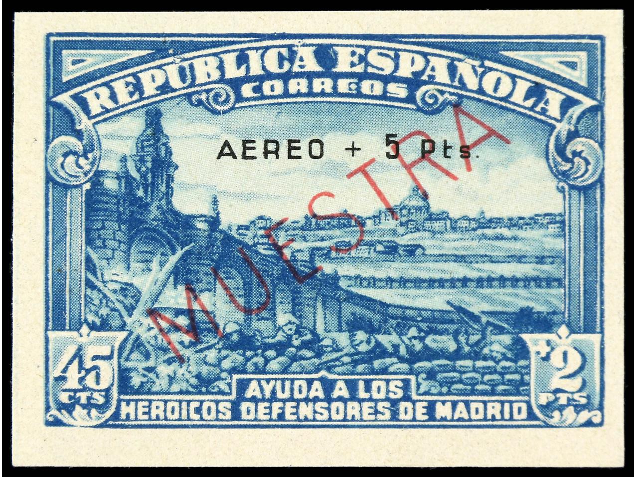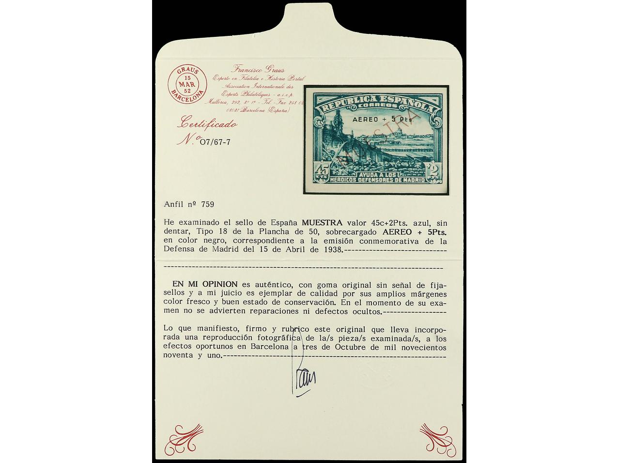 ESPAÑA. Aéreo + 5 pts. azul. HABILITACIÓN MUESTRA SIN DENTAR. Emitido sin goma. Cert. GRAUS. Ed.759 M. Cat. 525€. (Image1) (Image2)