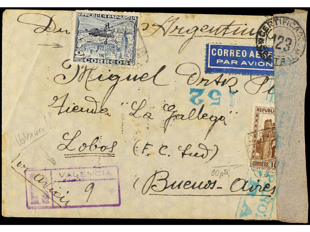 ESPAÑA. 1938. VALENCIA a BUENOS AIRES. 2 pt. azul dent. 10 (raro) y 10 pts., mat. fechador. Ed.770A + 772. (Image1) (Image2)