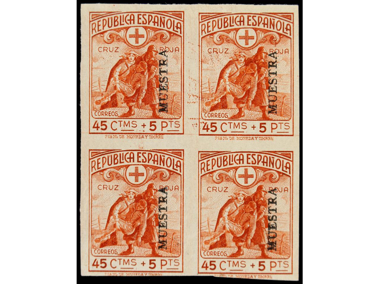ESPAÑA. 45 cts. + 5 pts. rojo. Bloque de cuatro SIN DENTAR con HABILITACIÓN MUESTRA. Ed.767Ms (4). Cat. +96€. (Image1)