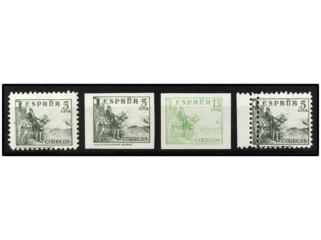 ESPAÑA. 5 cts. verde. 3 sellos dentado, sin dentar y doble dentado vertical y 15 cts. verde amarillo sin dentar. COLORES CAMBIADOS. RARO conjunto. Ed.816ec, ecs, ecdd y 819ecs. Cat. +304€. (Image1) (Image2)