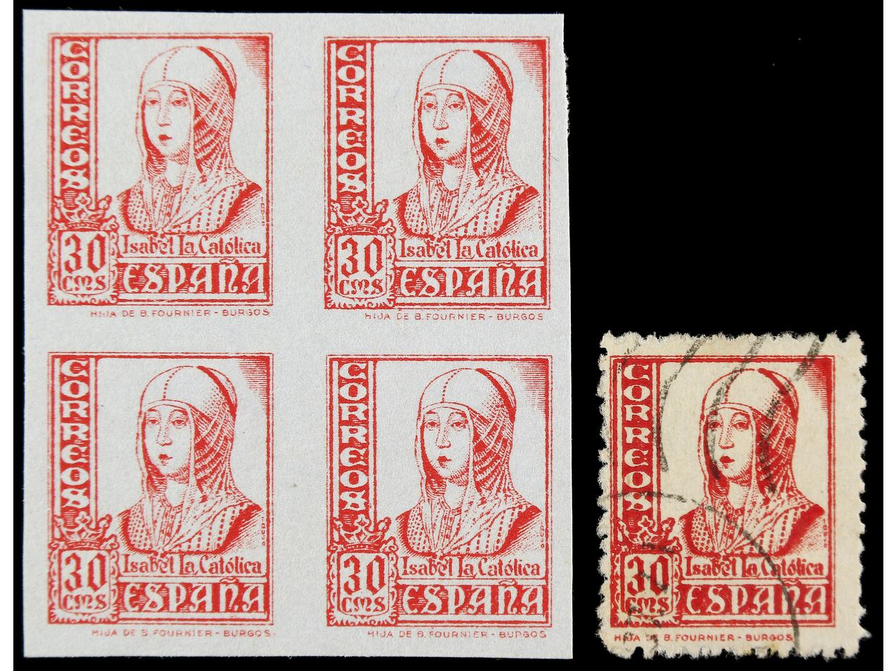ESPAÑA. 30 cts. carmín, pie de imprenta a la izquierda y 30 cts. carmín bloque de cuatro sobre papel azulado (ensayo de color). Ed.823 y 823et.